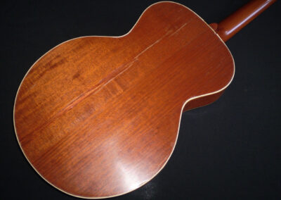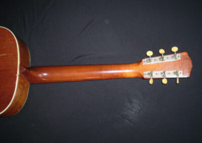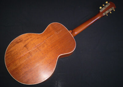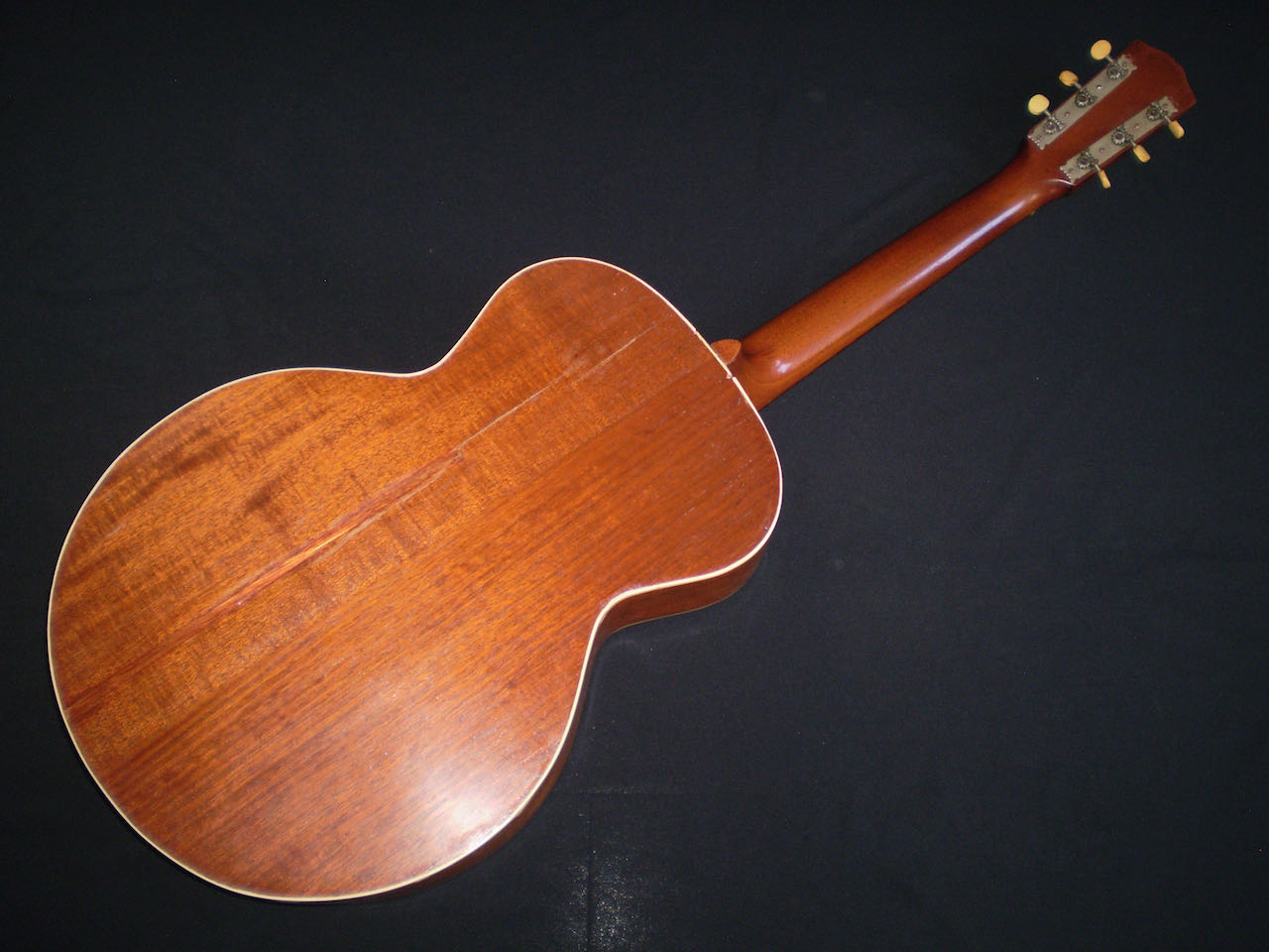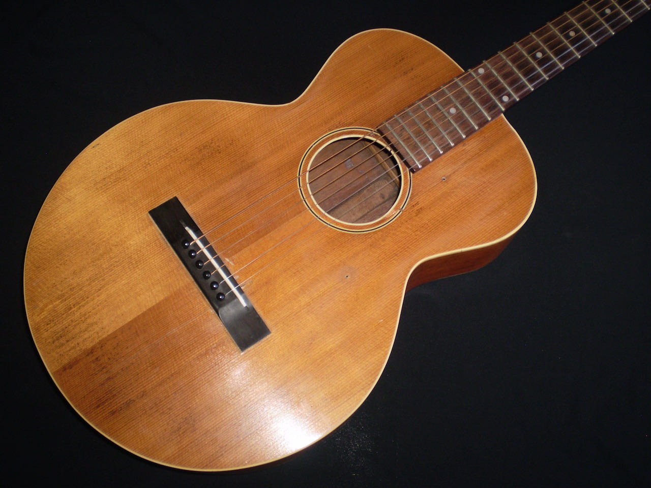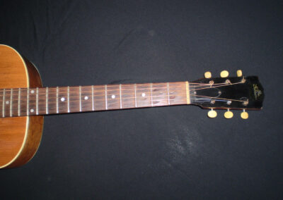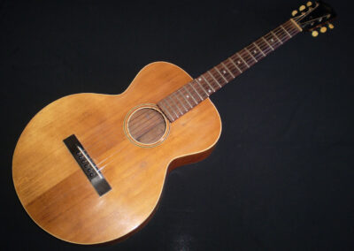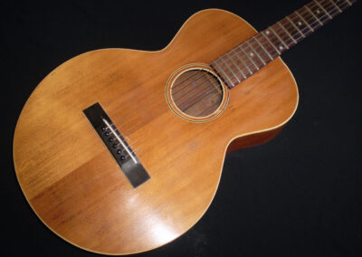 NEW ARRIVAL  Only made between 1926 – 1931 as a flat top with circular lower bout, this has to be one of the rarest Gibson models around – and arguably the most important. This L-1 is a 00 size, H braced guitar, and only 12 frets to the body which changes the whole feel of the guitar. Built incredibly lightly, this is one of the most resonant guitars I’ve played, and a fingerpicker’s dream. The volume for such a small guitar is quite amazing, and the balance is very even. The guitar has been restored by luthier Graham Parker, and he has done a fantastic job – his attention to detail, and sensitivity are very impressive. There are numerous crack repairs, a narrow back insert, and some distortion to the top around the soundhole, yet it feels strong, and not the kind of guitar you have to handle with kid gloves. This is a great example of a guitar that you just don’t want to put down, it has warmth and depth in it’s tone, and a great feeling neck. It comes in a non original hard case.