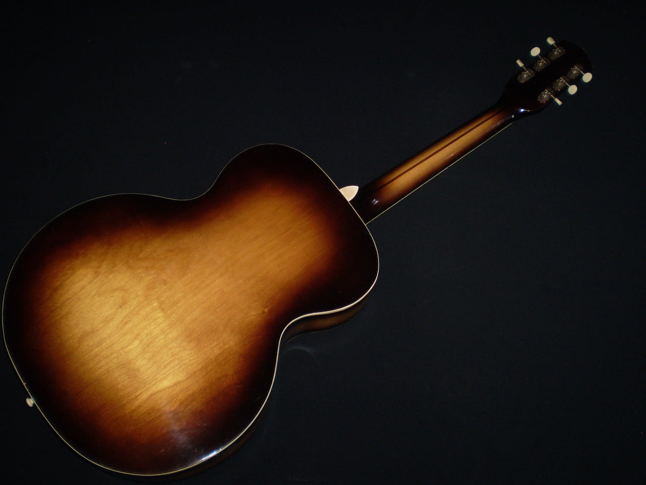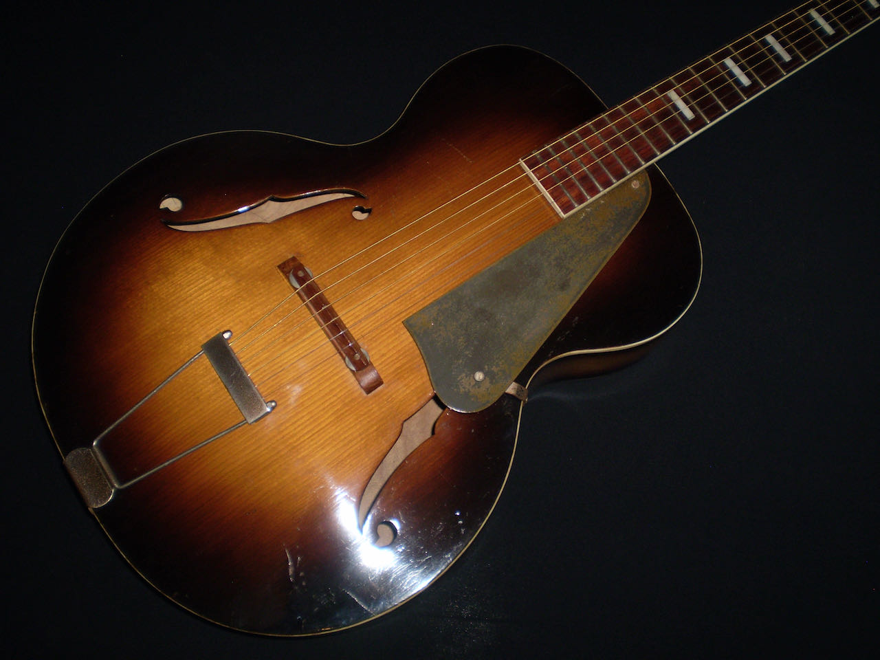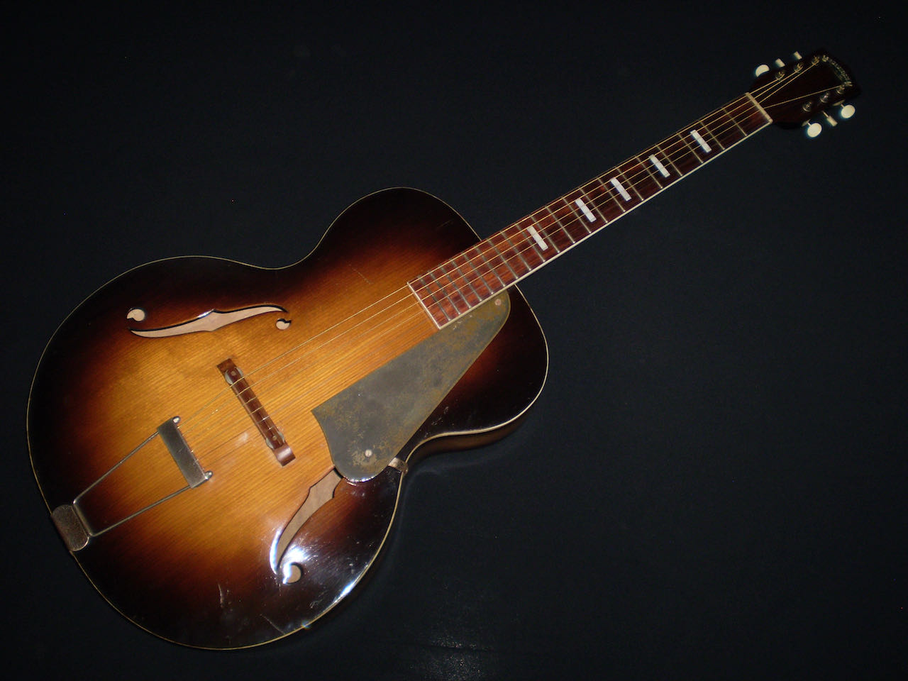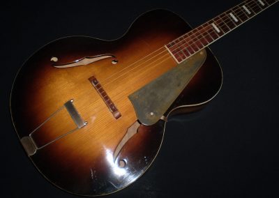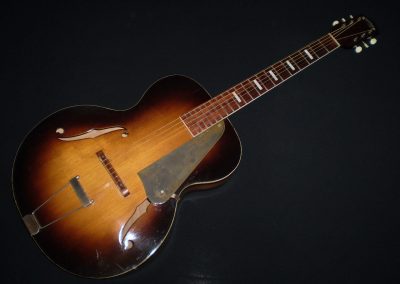 NEW ARRIVAL The Triumph was introduced in Epiphone’s original archtop line of 1931, with a 15 3/4″ lower bout, Walnut back and sides, 3 segment F holes, and the Masterbuilt block logo. By 1933 the body was increased to 16 3/8” with Maple back ad sides, and in 1936 it went up to 17 3/8” and remained with that specification until 1958. So a first year of issue model, in the rarest spec is quite a find. The guitar has a big, bright sound, with good clarity and definition. The Brazilian Rosewood fingerboard with block inlays, and bound body and fingerboard are signs of real quality. Unusually for an arch top of this age, the action is good all the way along the neck, making the playability very easy. The guitar is in all original condition – although the Bakelite pickguard was painted over at some point – and very clean for it’s age. It even comes in it’s original hard case.