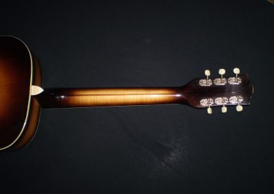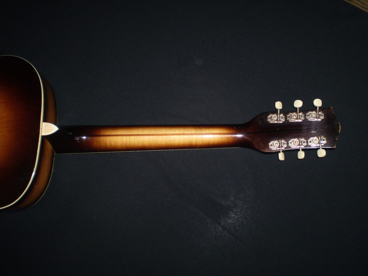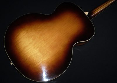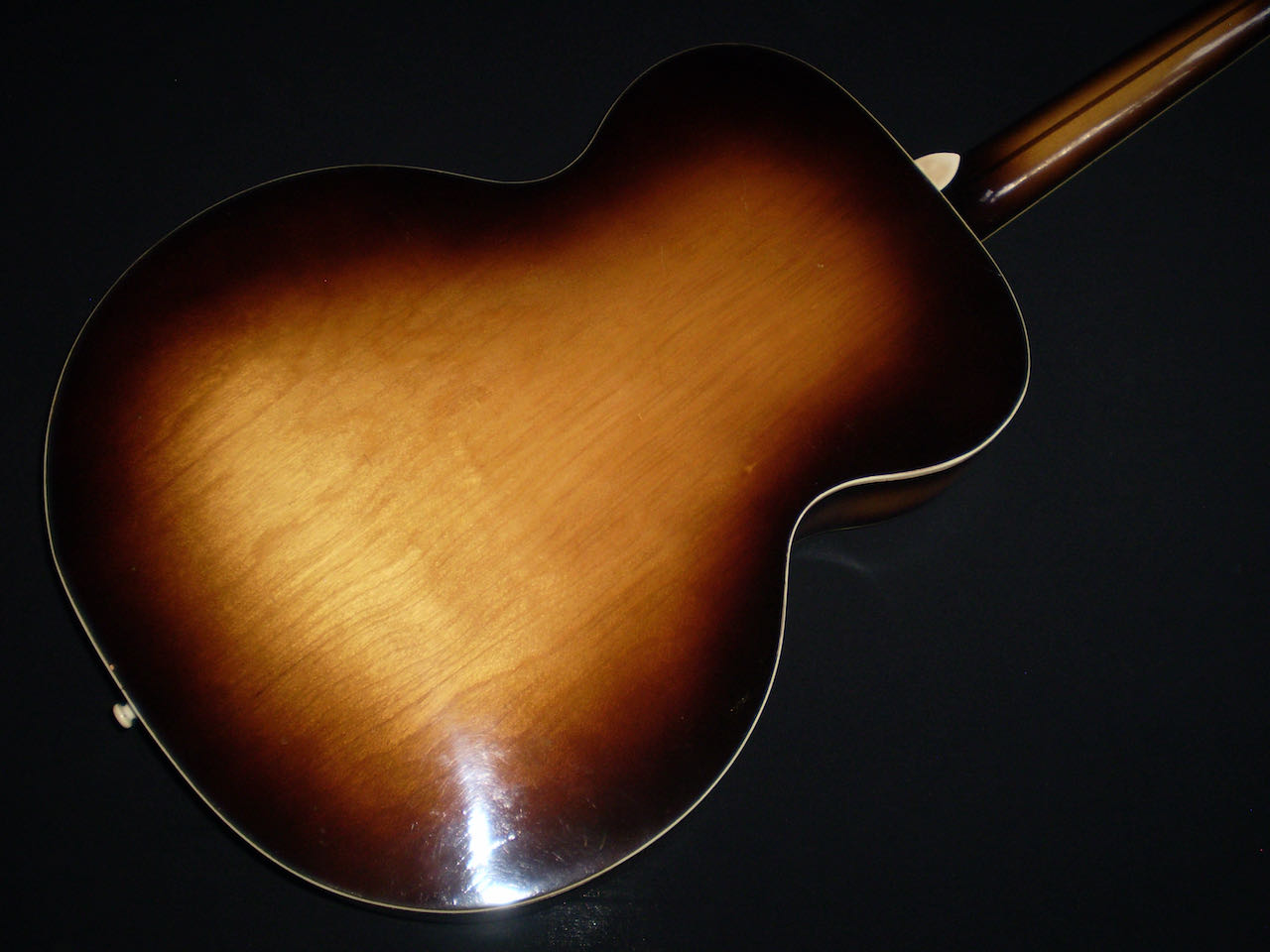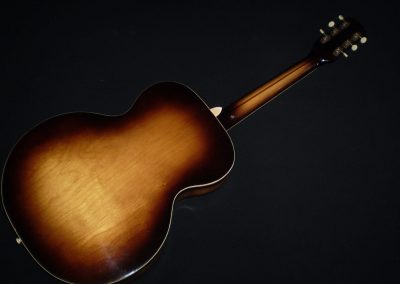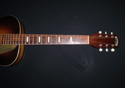 NEW ARRIVAL The Triumph was introduced in Epiphone’s original archtop line of 1931, with a 15 3/4″ lower bout, Walnut back and sides, 3 segment F holes, and the Masterbuilt block logo. By 1933 the body was increased to 16 3/8” with Maple back ad sides, and in 1936 it went up to 17 3/8” and remained with that specification until 1958. So a first year of issue model, in the rarest spec is quite a find. The guitar has a big, bright sound, with good clarity and definition. The Brazilian Rosewood fingerboard with block inlays, and bound body and fingerboard are signs of real quality. Unusually for an arch top of this age, the action is good all the way along the neck, making the playability very easy. The guitar is in all original condition – although the Bakelite pickguard was painted over at some point – and very clean for it’s age. It even comes in it’s original hard case.