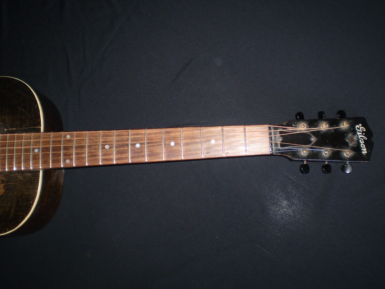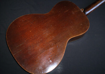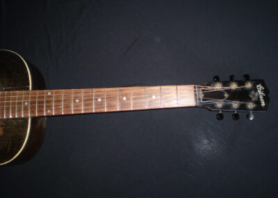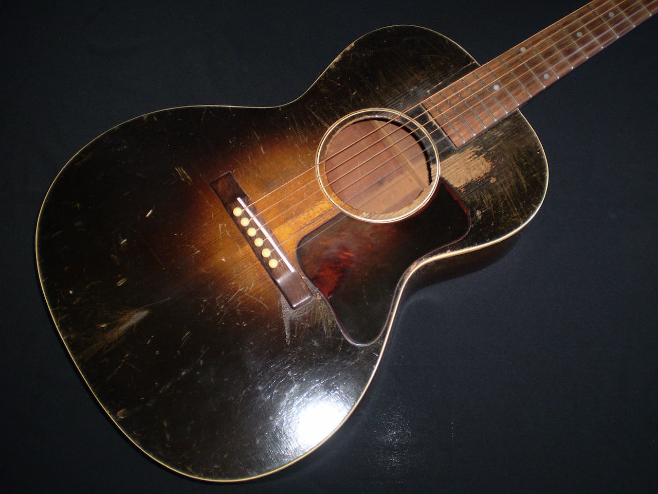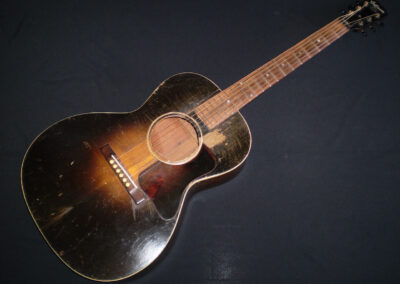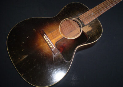 NEW ARRIVAL The L00 is probably Gibson’s most desirable pre war acoustic, and they’re becoming more difficult to find. This is an old warhorse of a guitar, with the scars to prove it – yet no visible cracks or repairs – and it’s survived to become one of the best sounding pre war Gibsons I’ve played, a real tone monster. As soon as you pick the guitar up it takes you to a different place and time, full of history. The notes ring with great separation and detail, with long sustain and beautiful shimmer. With this kind of history, the guitar fits like a glove, the body size, the V neck, and comfortable action. This is a great chance to own a piece of Gibson history – it even comes in it’s original (equally battered) hard case.
