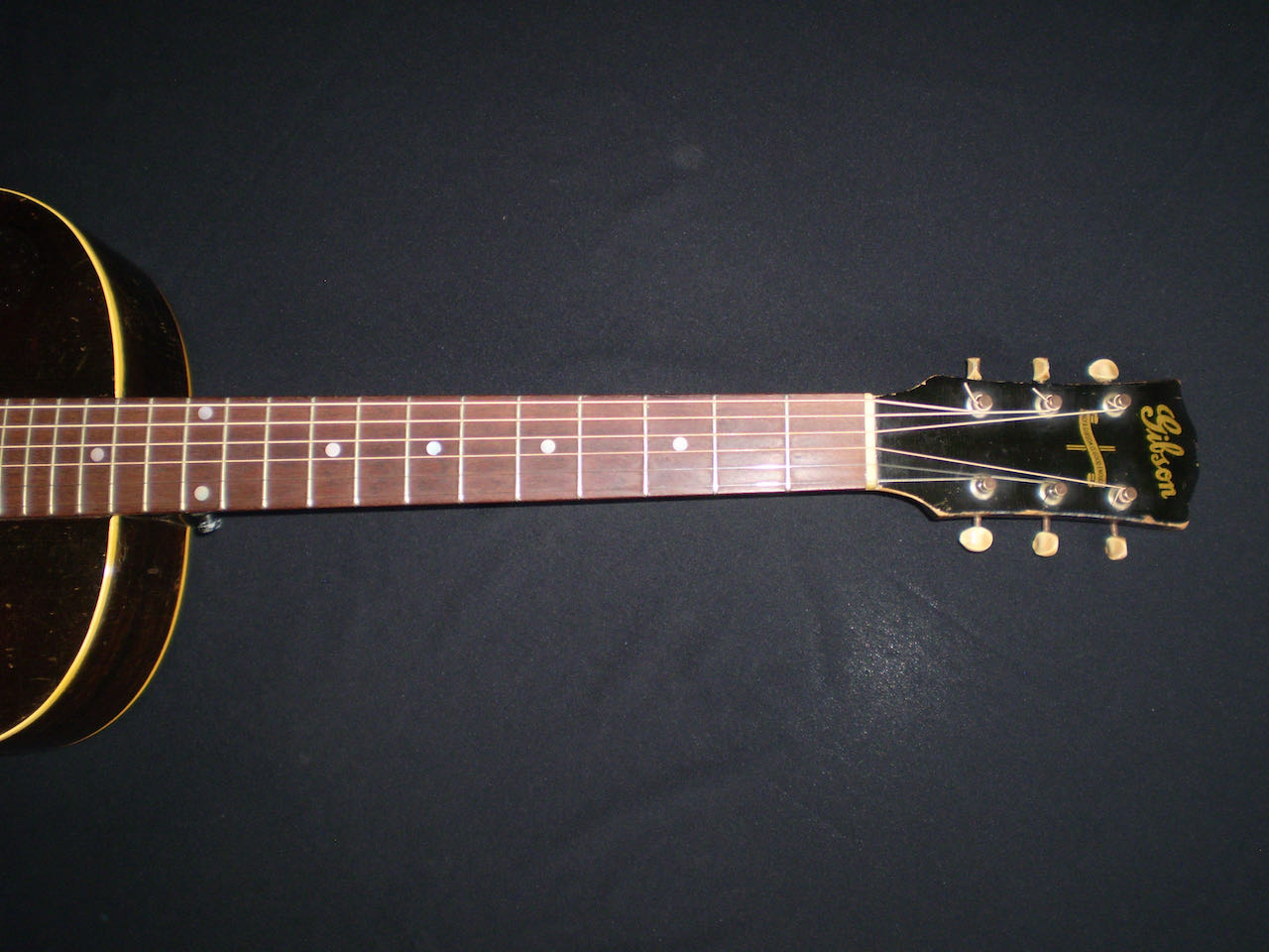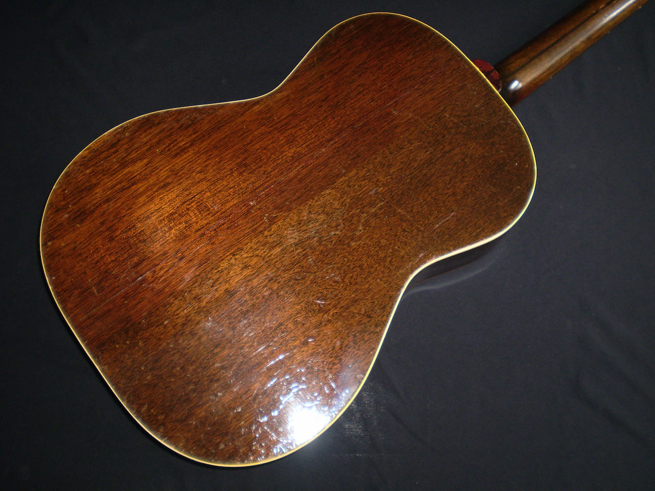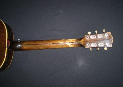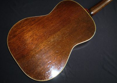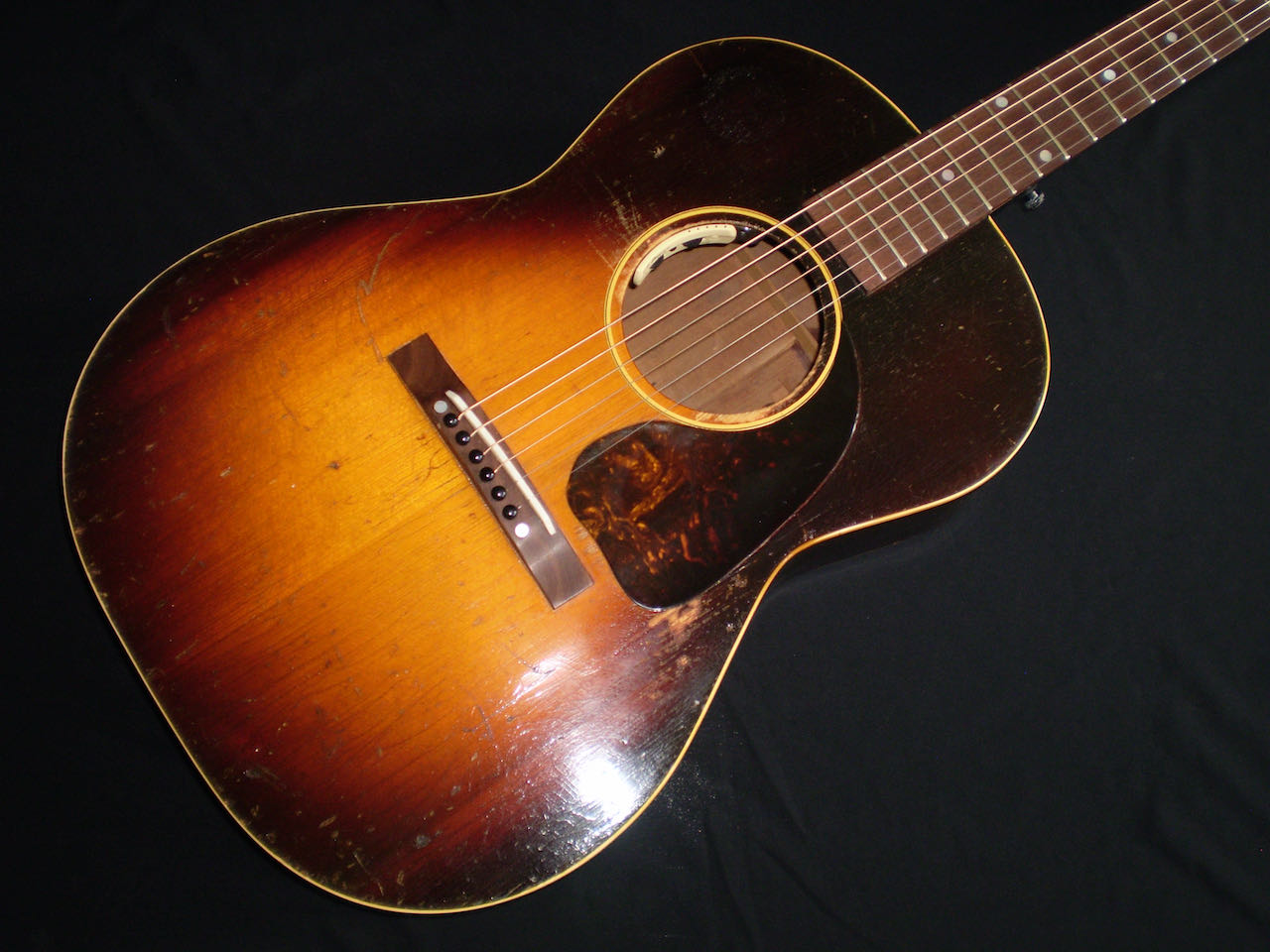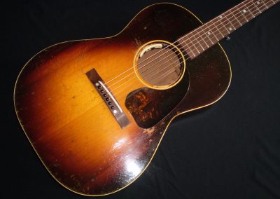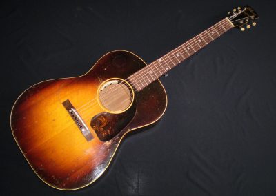 SOLD They call the LG2 the mini J45, and you can see why. It’s an incredibly versatile guitar for a 00 size, and what it lacks in bass boom, it makes up for in mid range thump and resonant trebles. As a World War 2 guitar it carries the famous ‘Only a Gibson is good enough’ Banner headstock logo. With that comes the chunky skunkstripe neck, which carries extra tone and sustain. The guitar plays like a dream, and the tobacco burst is simply stunning. Tonally it’s one of those guitars that just takes you to different musical places, and within 5 minutes you don’t want to put it down. The guitar has lots of visible battle scars, and lacquer checking, plus one long, tightly repaired back crack, and a small repaired pickguard crack. It has an LR Baggs Anthem pickup fitted, which sounds very natural when plugged in. To add to the cool factor, the guitar comes in it’s original croc hard case.
