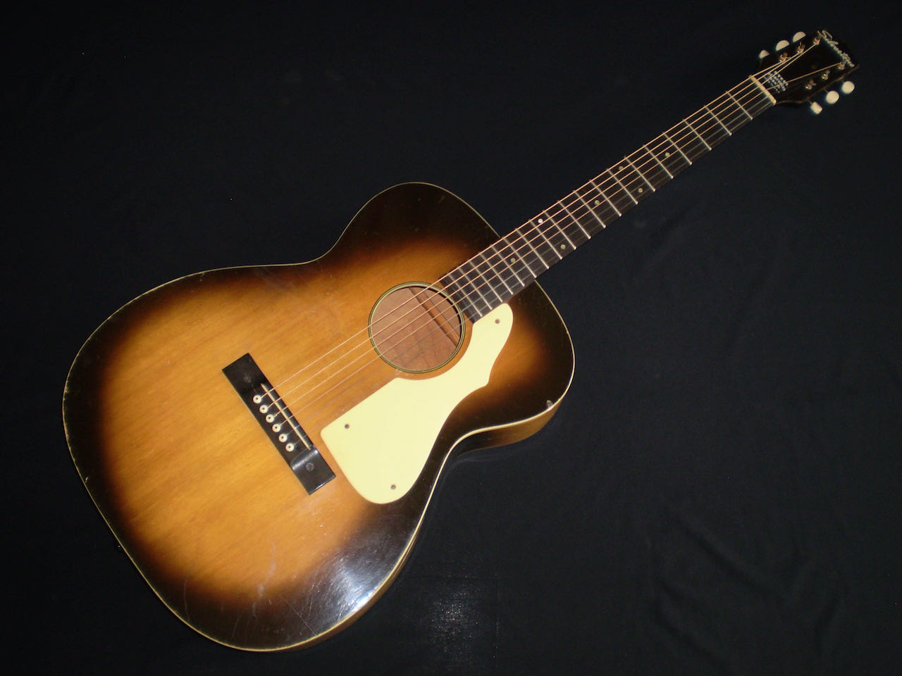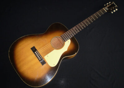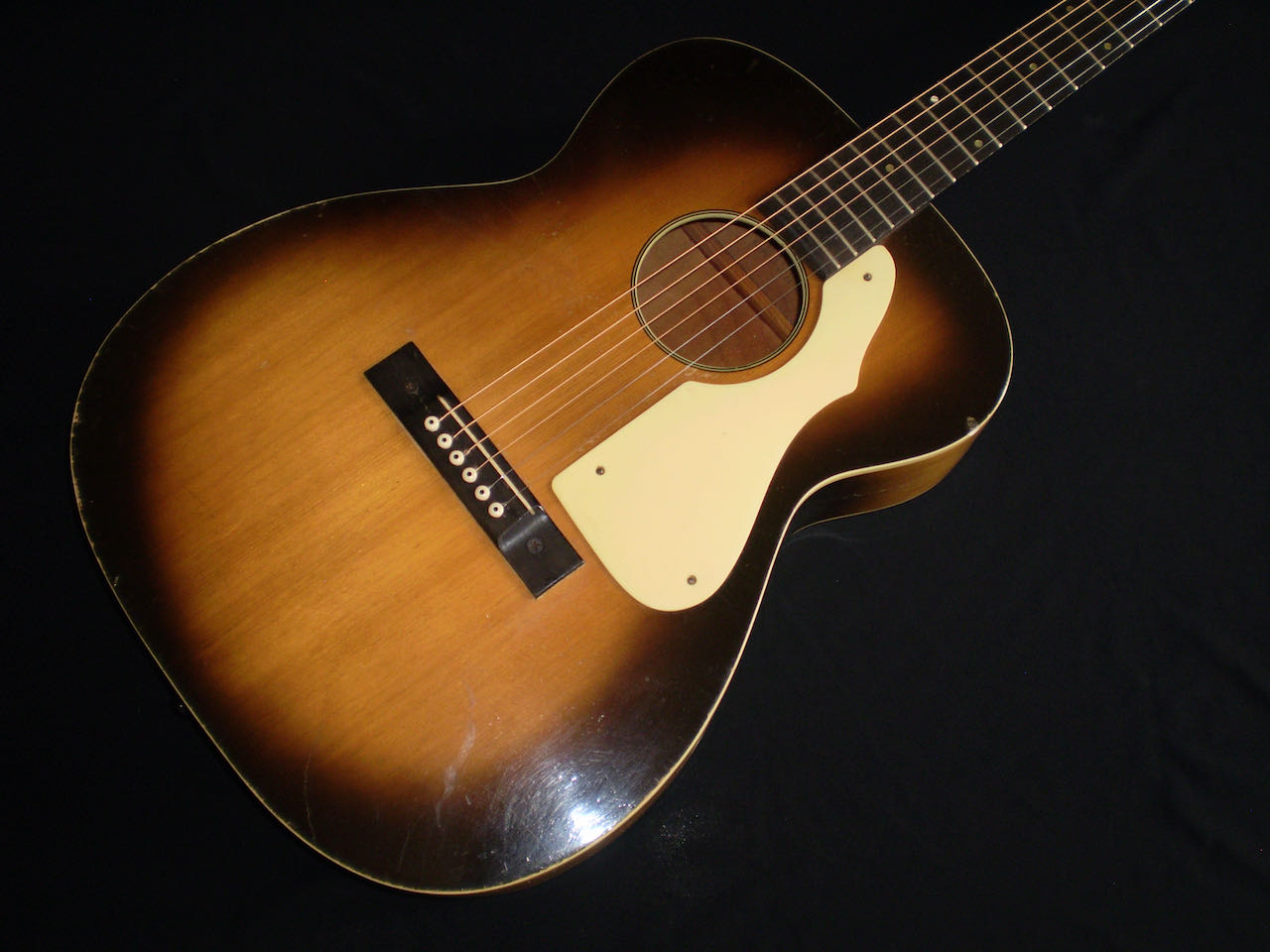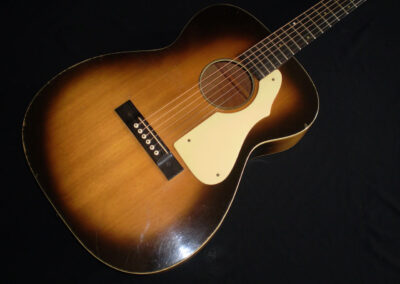 NEW ARRIVAL This Silvertone 602 was made in the USA by Harmony, and is branded as an H602, only with a Silvertone headstock decal. The model was only made between 1956 – 1959, produced for the Sears & Roebuck stores as part of the guitar boom of the 50’s. The guitar features a Spruce top, with Birch back and sides, a Poplar neck with Ebonised Maple fingerboard, and a very distinctive pickguard. It has ladder bracing, giving the tone an old time, mid range snap. The guitar is in good condition for it’s age, with one repaired side crack. The action is set for slide playing, but works really well for cowboy chords. It’s a real piece of 50’s American musical history, really authentic sounding, and very cool.