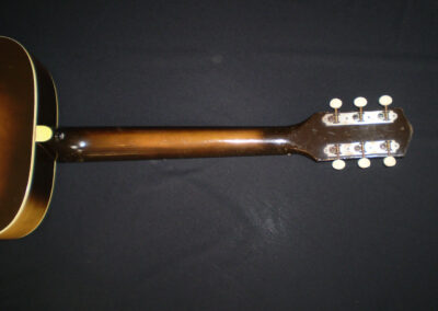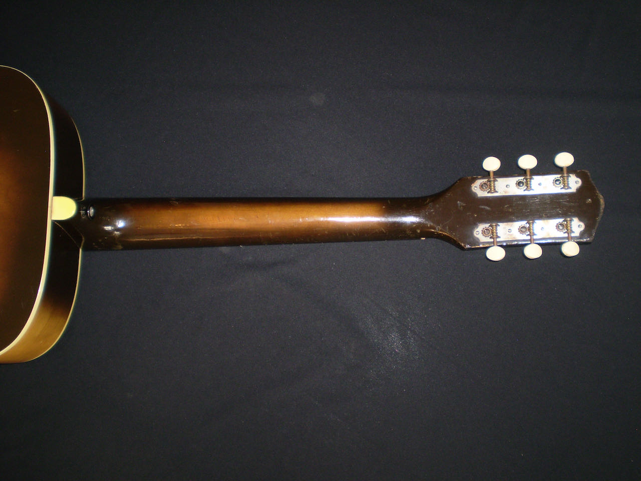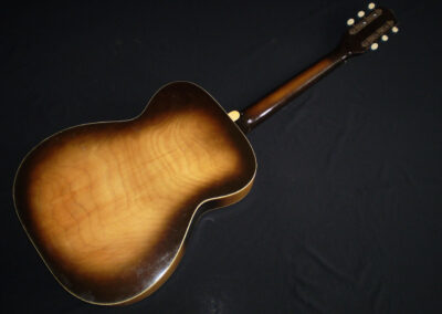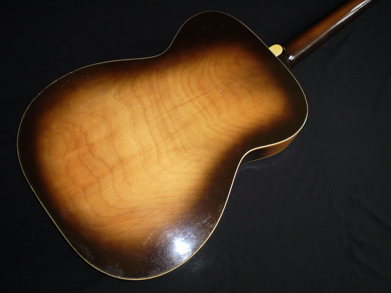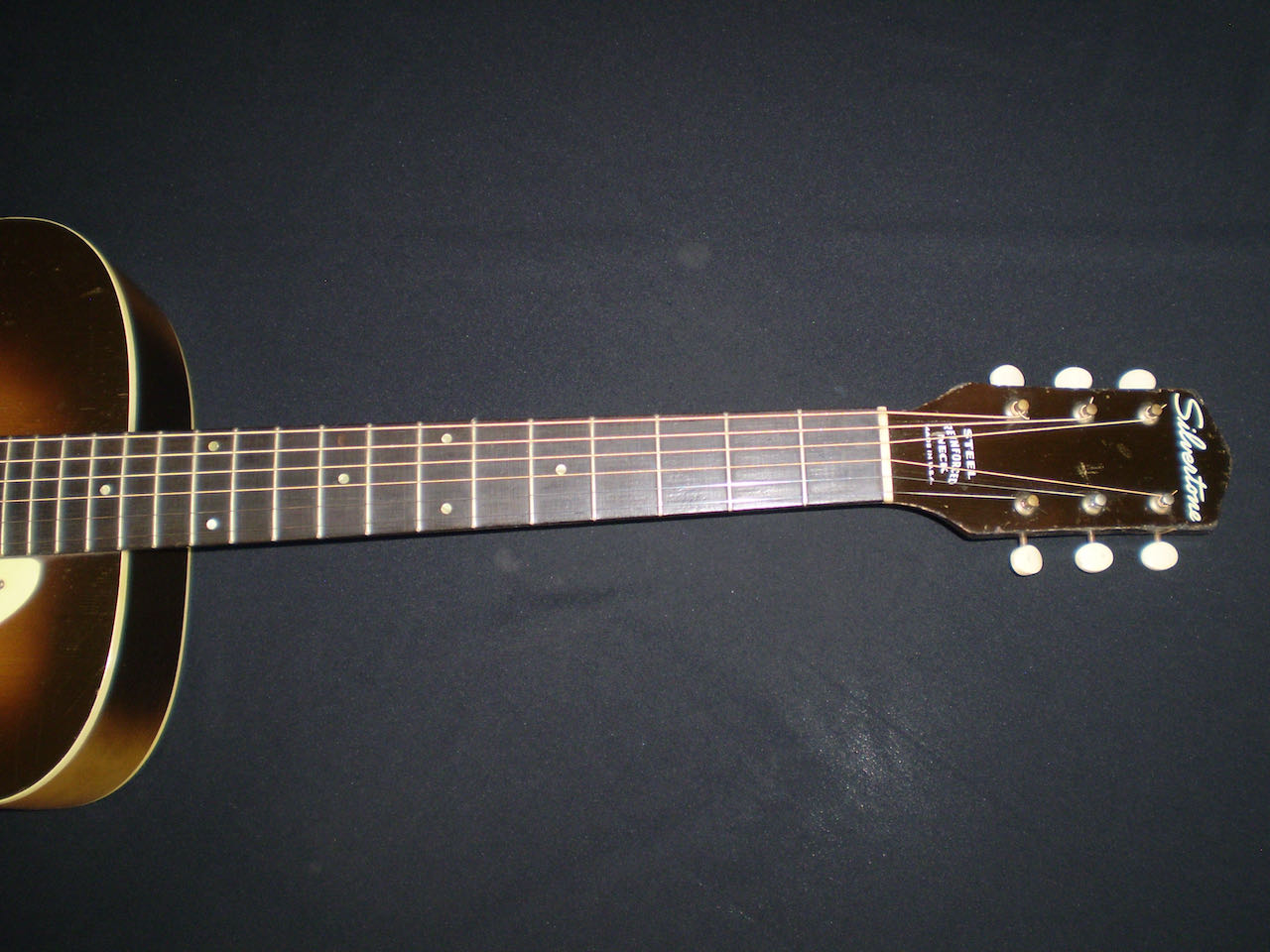 NEW ARRIVAL This Silvertone 602 was made in the USA by Harmony, and is branded as an H602, only with a Silvertone headstock decal. The model was only made between 1956 – 1959, produced for the Sears & Roebuck stores as part of the guitar boom of the 50’s. The guitar features a Spruce top, with Birch back and sides, a Poplar neck with Ebonised Maple fingerboard, and a very distinctive pickguard. It has ladder bracing, giving the tone an old time, mid range snap. The guitar is in good condition for it’s age, with one repaired side crack. The action is set for slide playing, but works really well for cowboy chords. It’s a real piece of 50’s American musical history, really authentic sounding, and very cool.