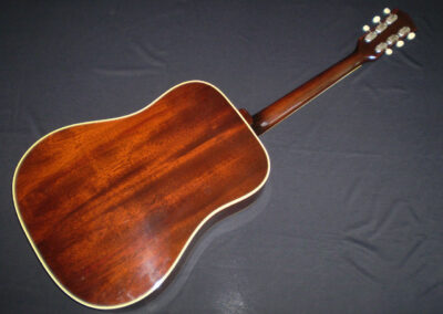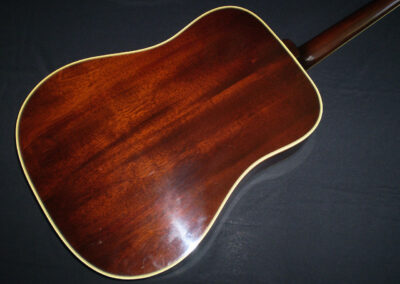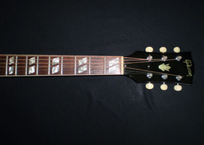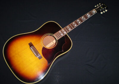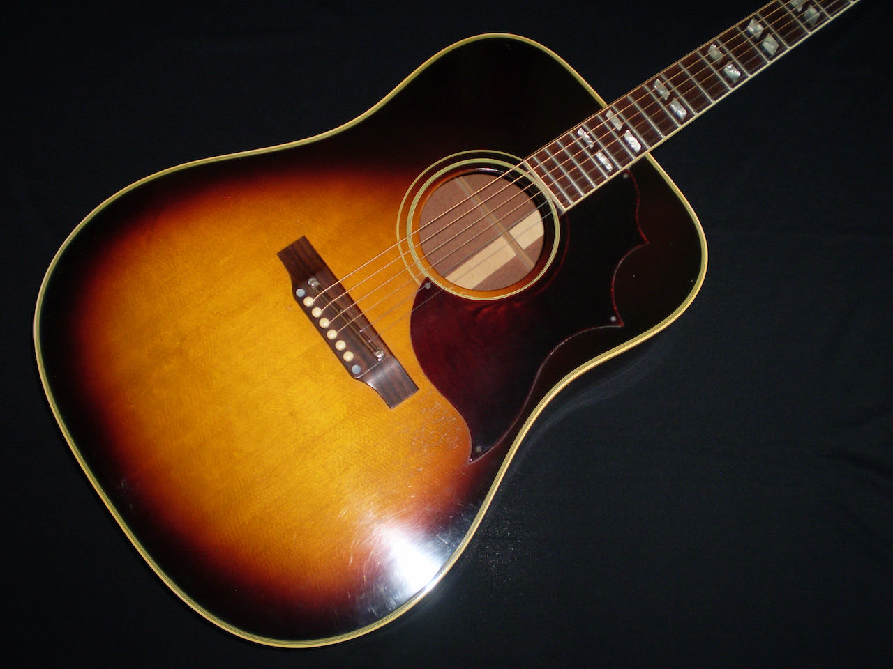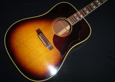 SOLD For me this is one of the most iconic looking Gibson acoustic guitars – a square shouldered dreadnought with a three point pickguard, a dark sunburst top, and eye catching pearl split parallelogram fingerboard inlays. Also it’s unusual to see such a beautifully figured Mahogany back. This guitar has all the unmistakable characteristics of a 60’s Gibson dreadnought which makes them sound so familiar, when you start playing your mind starts racing as it sounds like so many of the great 60’s recordings – mellow, smooth, warm and rich. The bound neck makes it feel very easy to play, with a slimmer 1 9/16” (39mm) neck, and the action is set just right. The guitar is in excellent condition, all original with no cracks or repairs, just some pickwear below the pickguard, and a few light dings around the top edge. The guitar comes in it’s original hard case.