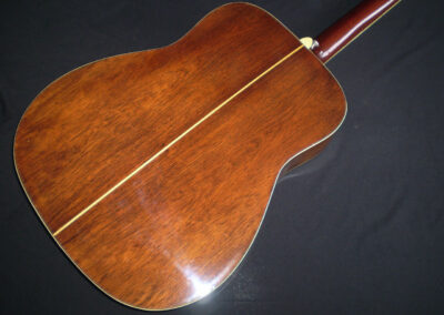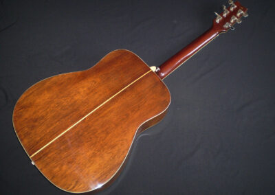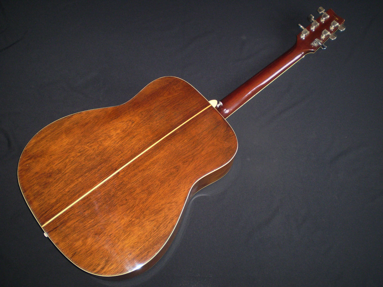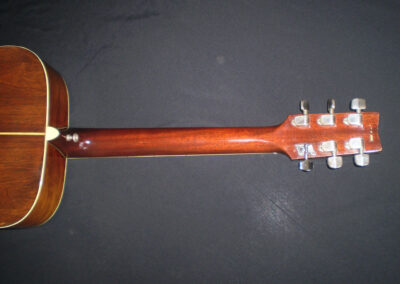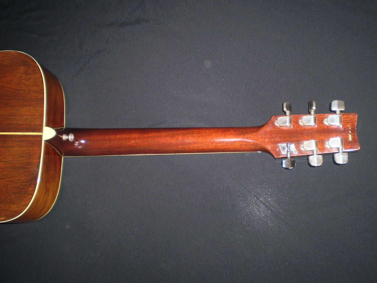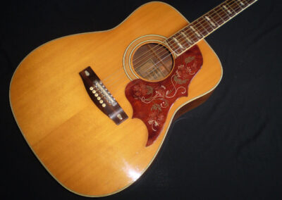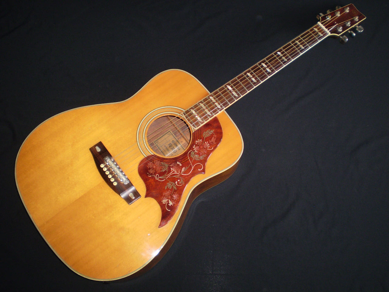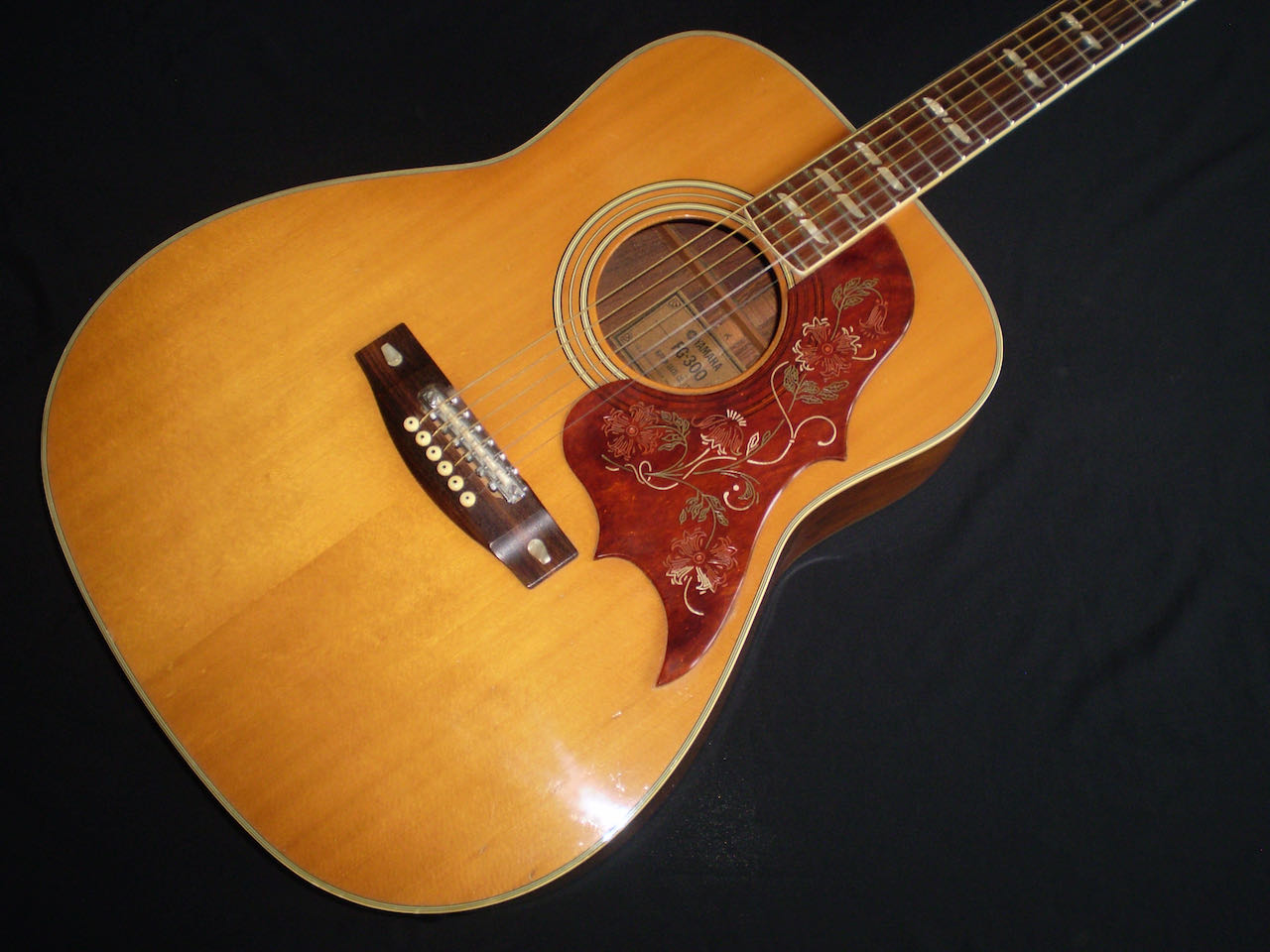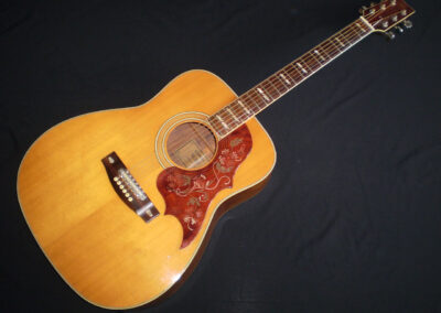 NEW ARRIVAL  Along with the FG-140 and FG-180, the Yamaha FG-300 was one of the original six-string jumbo acoustics built in Japan starting in 1969, and it became the flagship guitar for Yamaha in the late sixties and early seventies. Built in 1972, this is a Nippon Gakki tan label Yamaha which was never made for export, but for the Japanese market only. There’s an argument that these guitars were built to a higher spec than the earlier Red labels, as they were ‘too good’ to export. It’s certainly one of the best examples I’ve played, and it captures a moment in time when – certainly in the folk scene – anyone who was anyone played a Yamaha. This example is in very good condition, with no cracks or repairs, just a few light nicks and dings. It’s a more deluxe model than the FG180, featuring classy fingerboard inlays, a beautifully designed pickguard, and a very cool adjustable saddle. The playability is excellent, and it has a room filling sound. One of the tuners is missing it’s back cover, and there’s a plugged jack socket on the bottom corner. The guitar comes in a modern hard case.