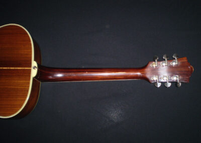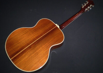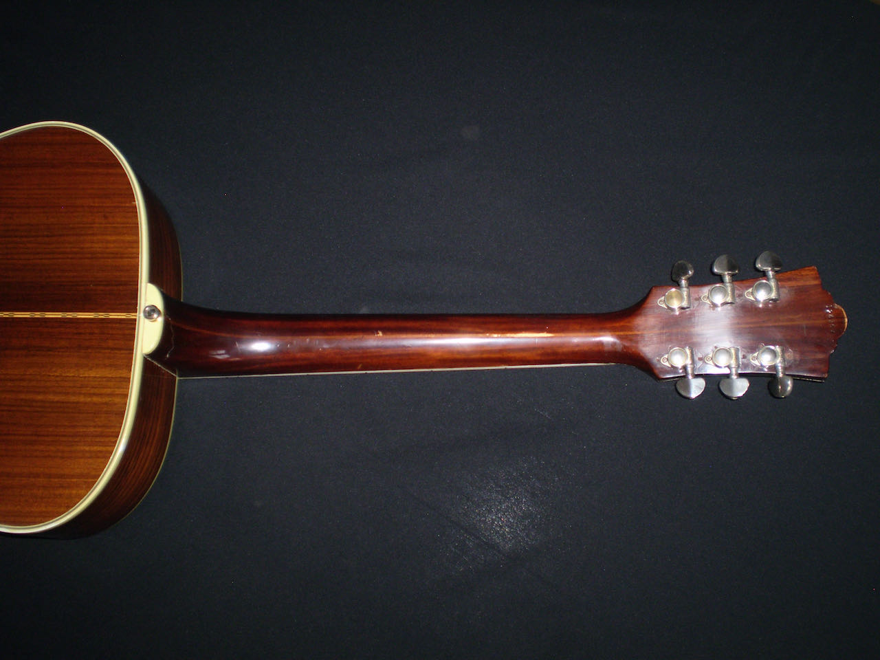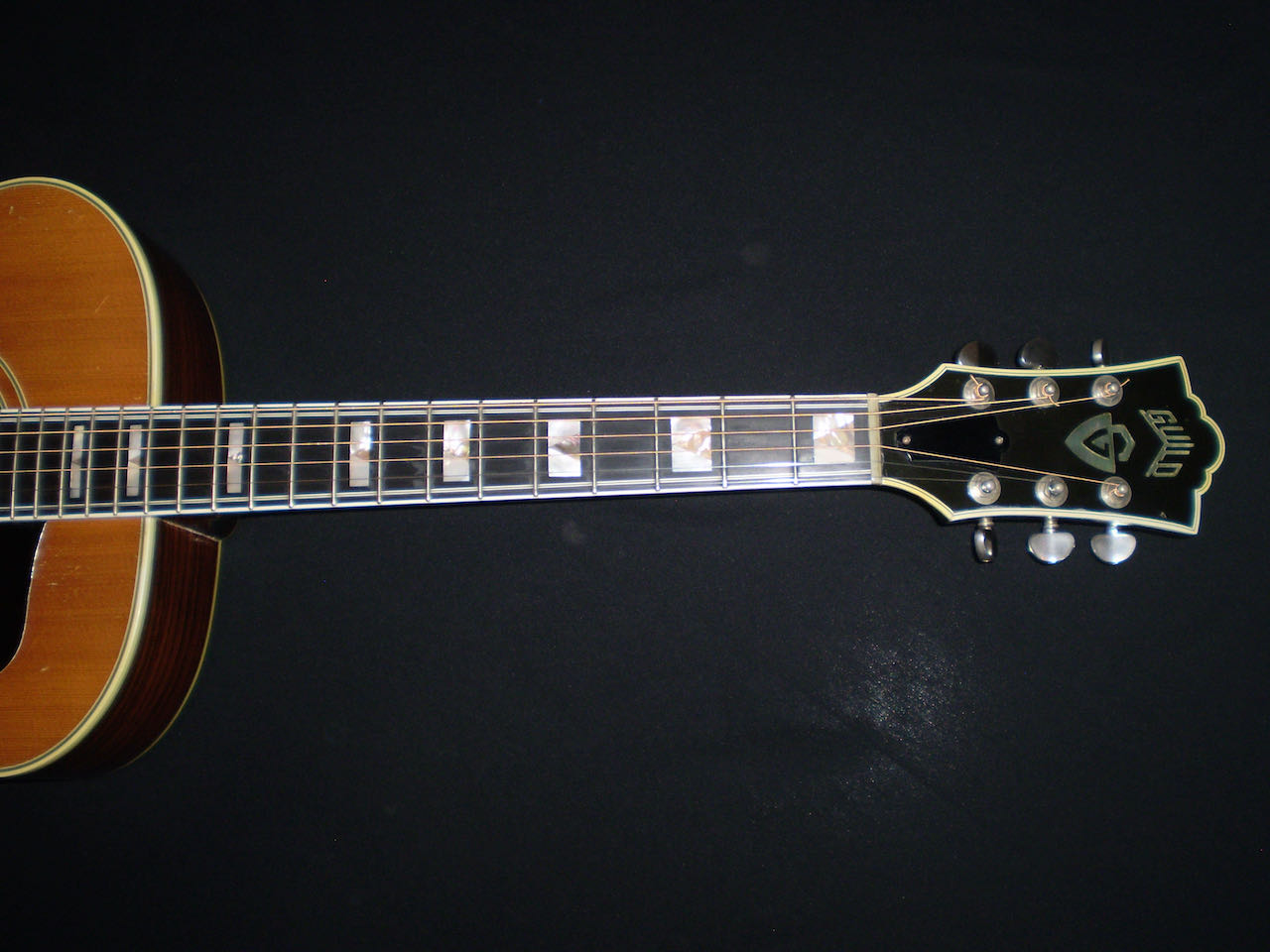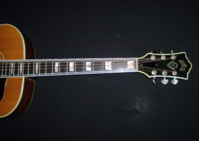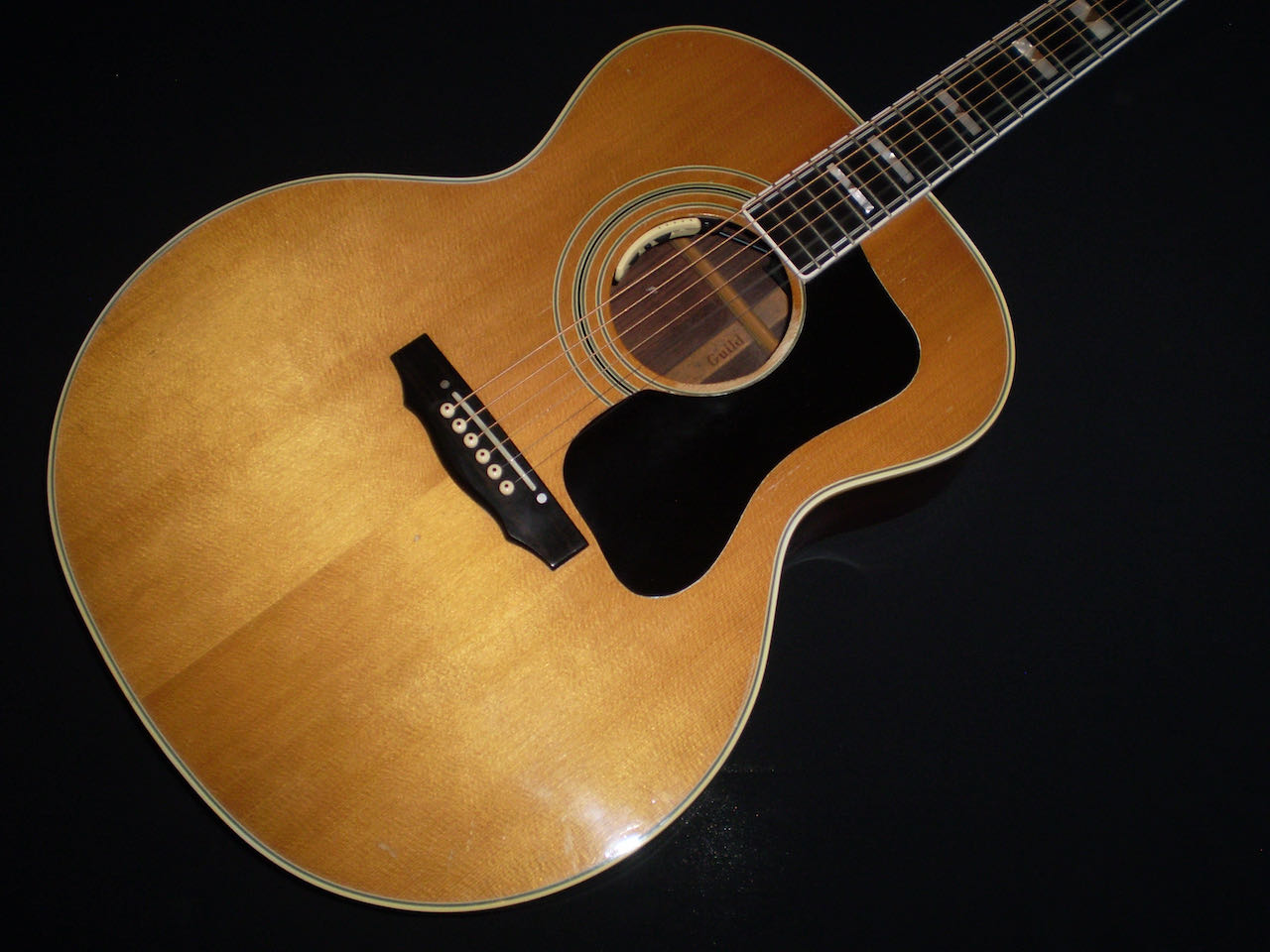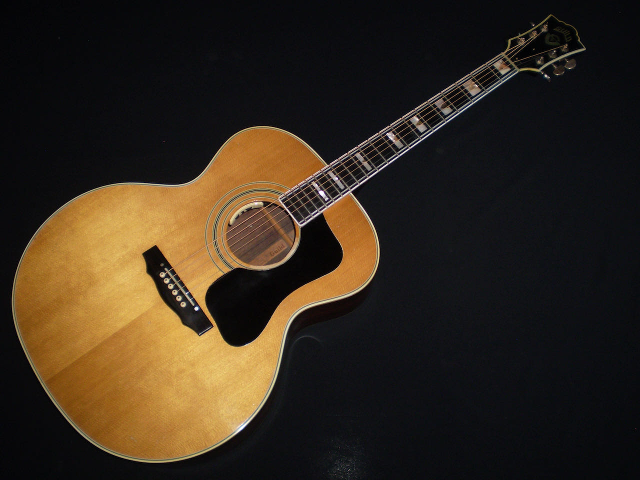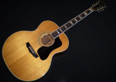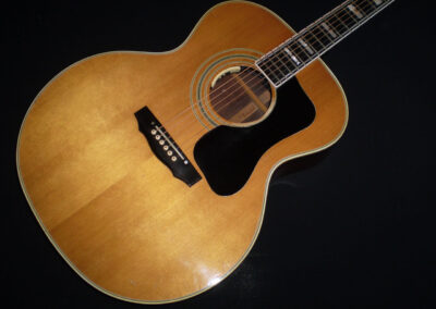NEW ARRIVAL  Guild have long gone below the radar of high end US acoustics, but jumbos is what they do best. This 1975 guitar is a particularly early example, from the famous Westerly factory. With a Spruce top and Rosewood back and sides, it’s a real powerhouse of a guitar. It’s dynamic, rich and resonant, moving a lot of air, it will cut through any mix. The looks are killer too – diamond block inlays on a bound Ebony fingerboard, the iconic G branded headstock, and the distinctive pickguard and two point bridge. The guitar is in very good condition with no cracks or repairs, a reasonable amount of playwear for a 51 year old, including a zigzag scratch on the back of the heel, and changed Grover tuners. The neck feels great with comfortable playability, and there’s an active LR Baggs pickup fitted. The guitar comes in it’s original branded hard case.