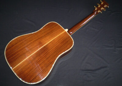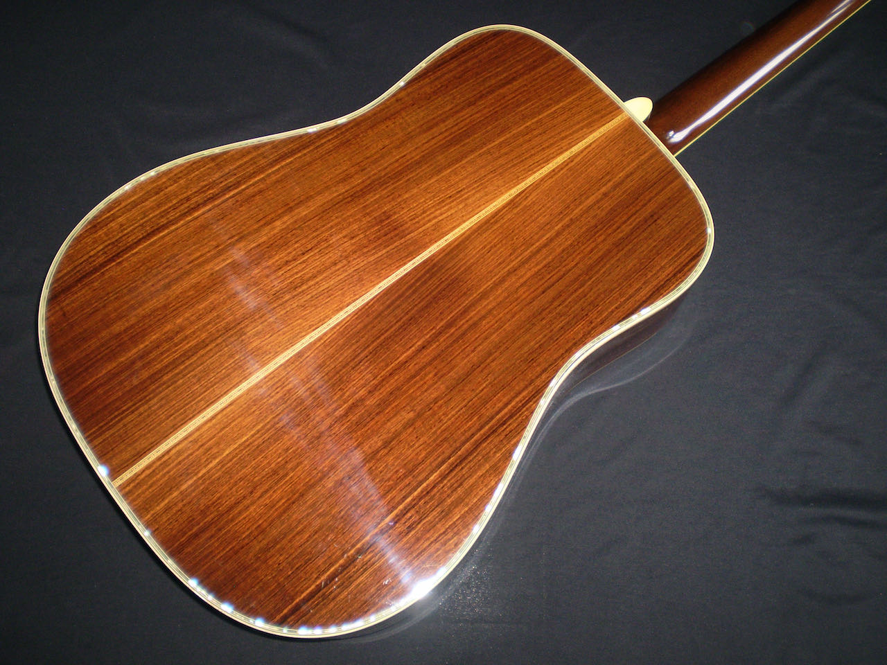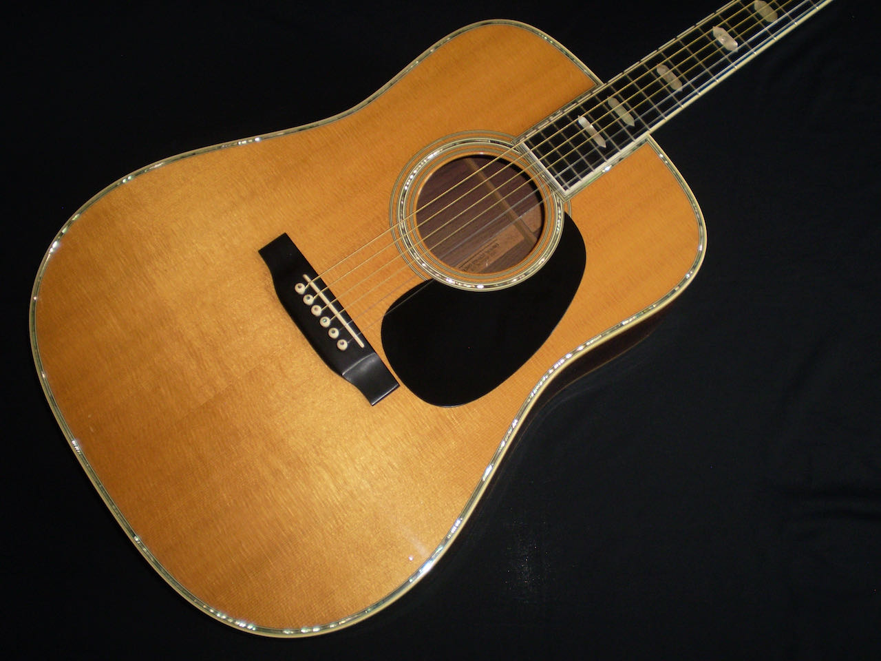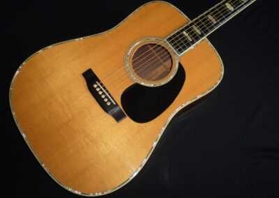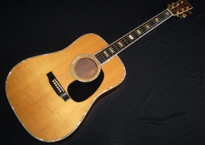 SOLD The D45 holds a place in history as being the most expensive, highly detailed, beautifully over the top dreadnought in Martin’s range. But is it the best sounding Spruce / Rosewood dreadnought….. well it’s pretty damn close. I sat down to play it before writing this, and lost an hour – it just sucked me in with it’s beguiling tone. Rich, dark, shimmering, resonant, I could run out of superlatives. This 35 year old guitar excels at just about everything; it strums, flat picks and plays fingerstyle on a different level to most guitars. With the age comes a maturity to the tone, a real openness that newer models can’t reach. The guitar is in excellent condition for it’s age, no cracks or repairs, just a little back binding separation at the waist, and the playability is fantastic. There’s an under saddle pickup fitted and the guitar comes in it’s original Martin branded hard case.