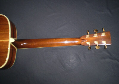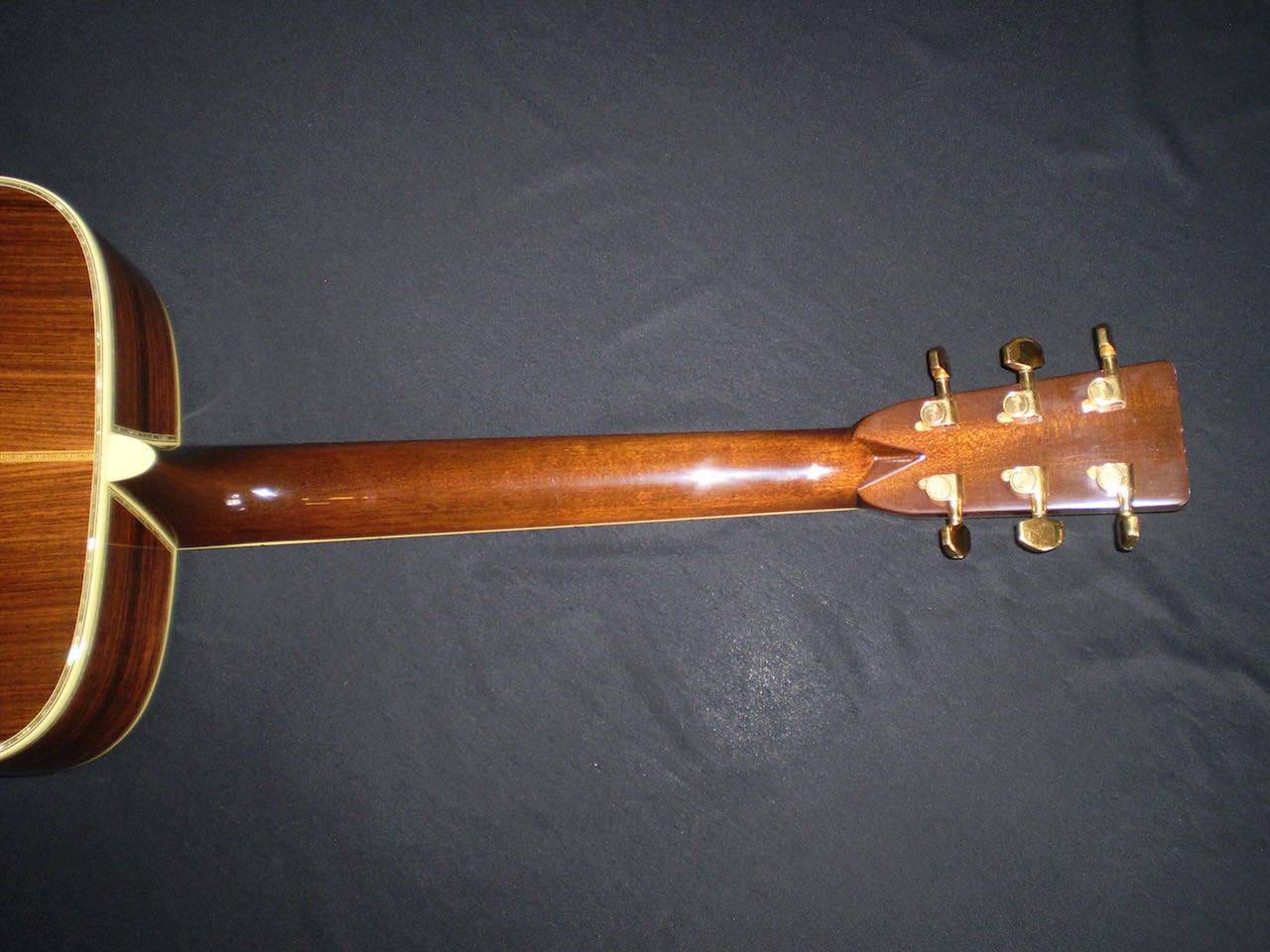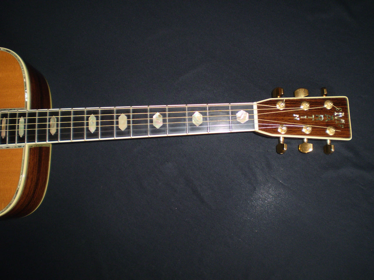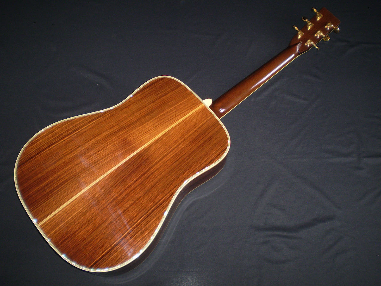 SOLD The D45 holds a place in history as being the most expensive, highly detailed, beautifully over the top dreadnought in Martin’s range. But is it the best sounding Spruce / Rosewood dreadnought….. well it’s pretty damn close. I sat down to play it before writing this, and lost an hour – it just sucked me in with it’s beguiling tone. Rich, dark, shimmering, resonant, I could run out of superlatives. This 35 year old guitar excels at just about everything; it strums, flat picks and plays fingerstyle on a different level to most guitars. With the age comes a maturity to the tone, a real openness that newer models can’t reach. The guitar is in excellent condition for it’s age, no cracks or repairs, just a little back binding separation at the waist, and the playability is fantastic. There’s an under saddle pickup fitted and the guitar comes in it’s original Martin branded hard case.