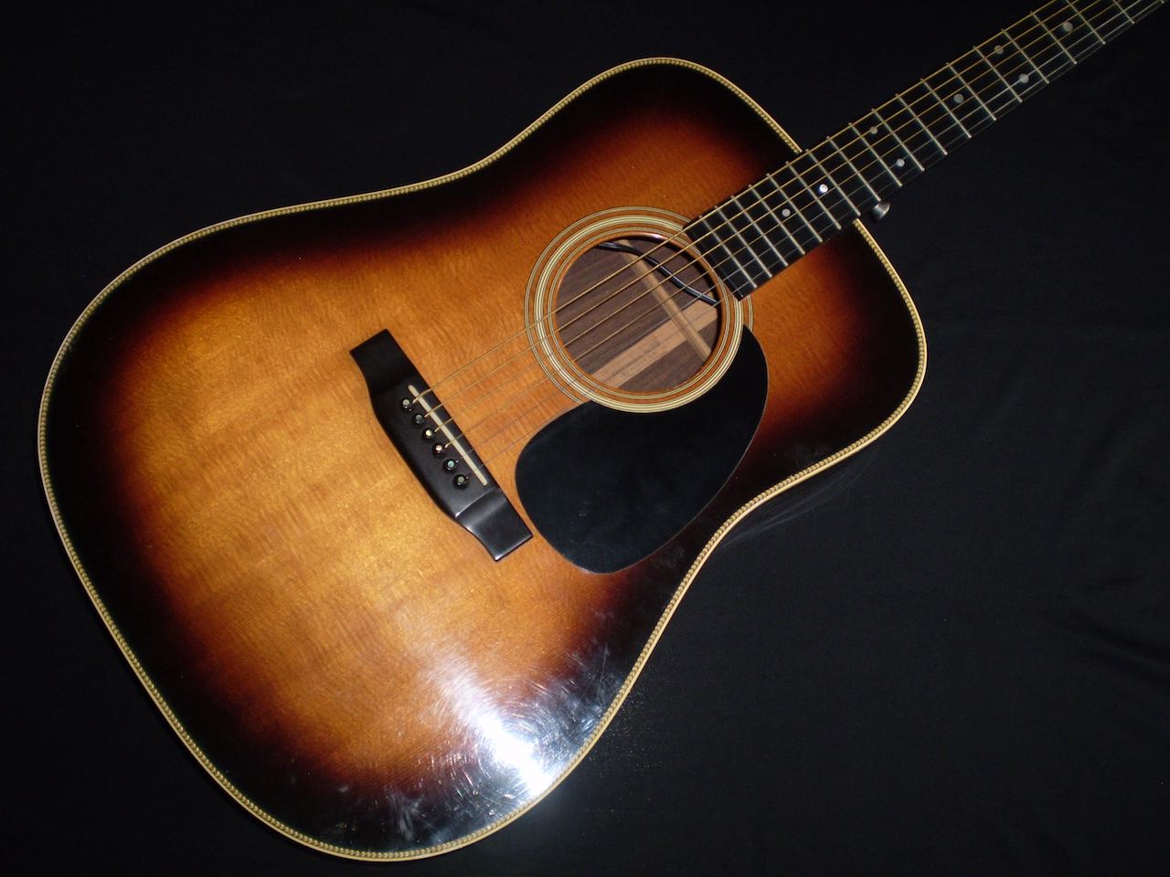 NEW ARRIVAL  The HD28 is noticeably different to a D28. Not just the herringbone trim that gives it a more deluxe look, but the scalloped bracing which allows the top to resonate more, giving a more lively playing experience. Never boomy, but more dynamic sounding. It’s a very versatile guitar, handling strumming and flat picking equally well, but also very comfortable with more gentle fingerstyle – a real all rounder. For a 35 year old guitar it’s in good condition, with lots of playwear, but no cracks or repairs. It’s also an unusual example of a sunburst HD28, which is pretty difficult to find, and very eye catching. The guitar is really playable, with a comfortable neck, and has an active under saddle pickup fitted.