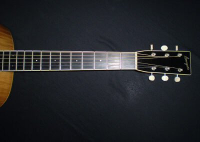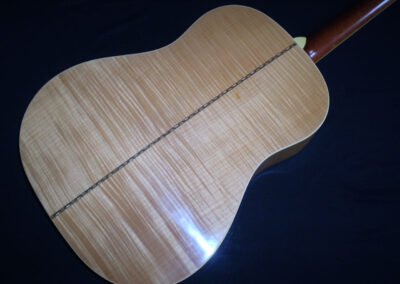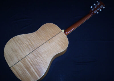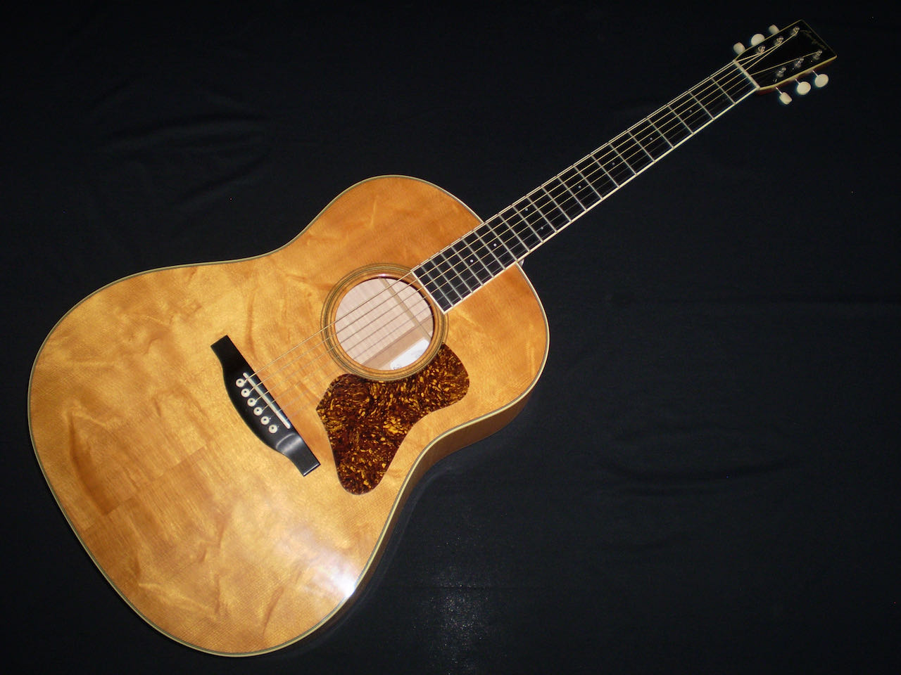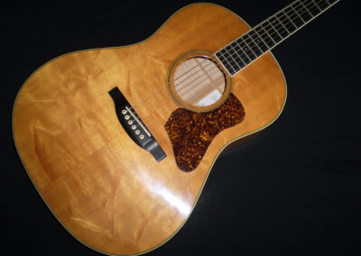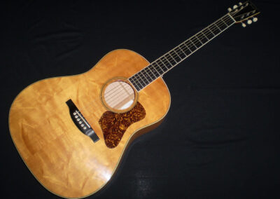 NEW ARRIVAL This Bourgeois Slope D has the most spectacular Bear Claw Spruce top I’ve seen, and coupled with beautifully figured Maple back and sides, it really is a power house of a guitar. As well as being beautiful, the Bear Claw has stiffened the top, making it more resonant and dynamic. Combined with Maple, which sweetens the upper mids and lower trebles, it punches a hole in the air, and will cut through any mix. As with all Dana Bourgeois guitars, the top has been tap tuned by hand, so it makes the most of its tonal complexities. Because the top is so eye catching, he’s kept the rest of the looks classic and understated. The bound Ebony neck and headstock are simply done, and the pickguard compliments the overall body shape. As you’d expect the playability is fantastic, the neck is very comfortable, and it’s a joy to play. The guitar is in excellent condition, and has really matured over the last 25 years. It comes in its original deluxe hard case.