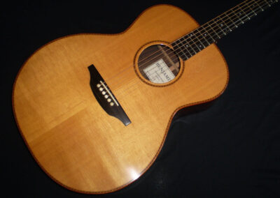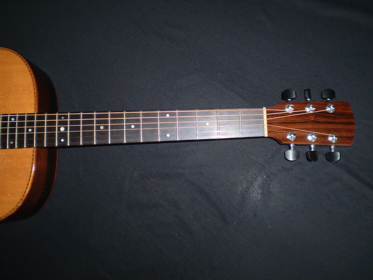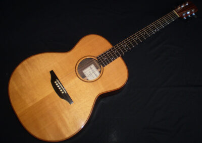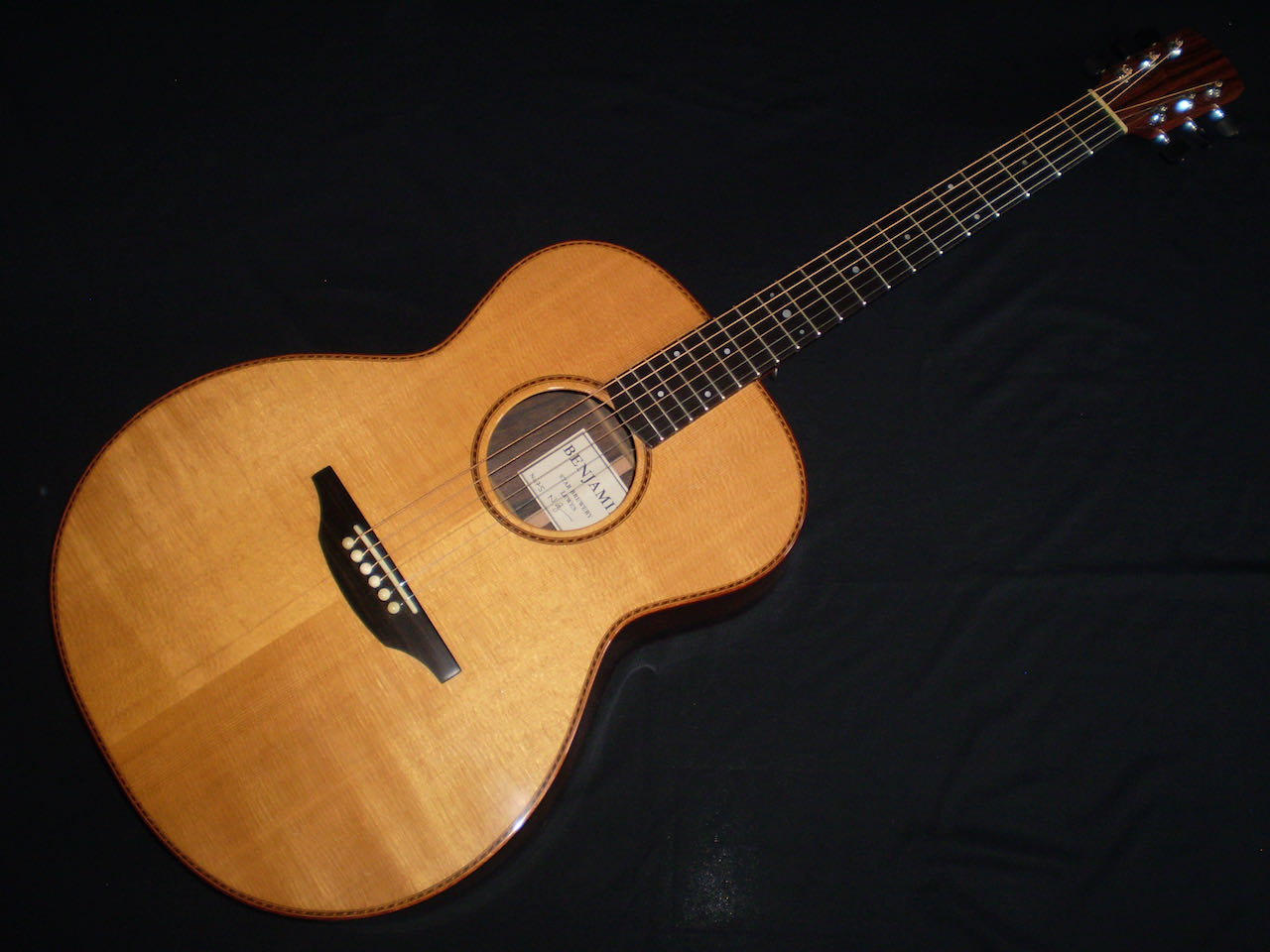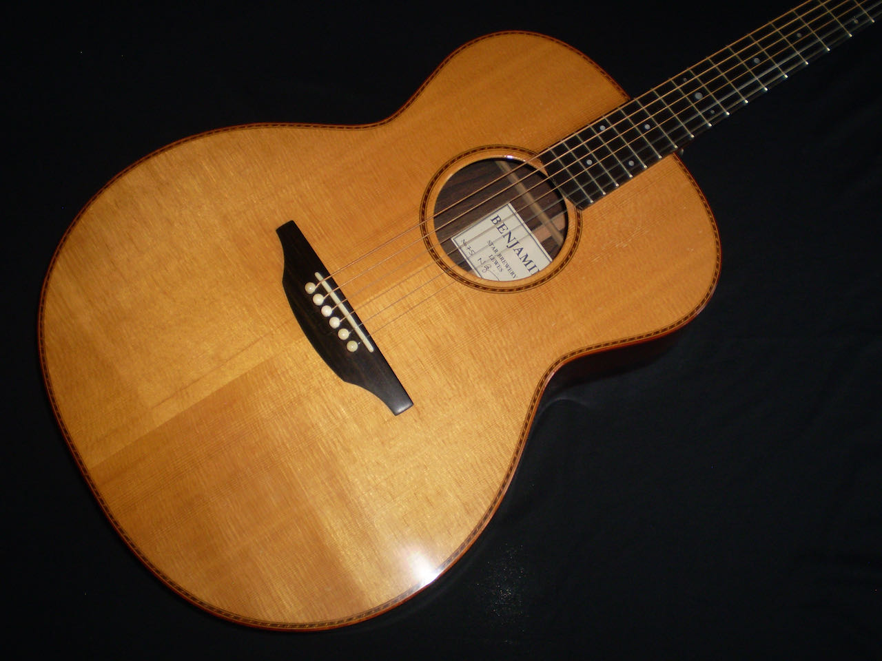 SOLD Nick Benjamin guitars are a well kept secret amongst acoustic players. His entry level guitars start at £4500 with a 2 year waiting list. So to find one of his fine instruments on the second hand market is pretty rare. This beautiful example is what Nick describes as a Jumbo OM body, featuring a Sitka Spruce top with stunning Brazilian Rosewood back and sides, plus Ebony fingerboard and bridge, and Gotoh 510 tuners. With a slightly enlarged OM shape, and tall narrow bracing, more air is allowed to move inside the body, creating greater resonance. These features, plus the high build quality make the guitar very responsive, highly articulate, with strongly defined single notes, very balanced and even sounding. The guitar is in good condition, with great playability. There are some noticeable playwear marks, and a repaired back crack on the upper bout, bass side. The guitar has a JJB Prestige pickup fitted and comes it it’s original Hiscox flight case.