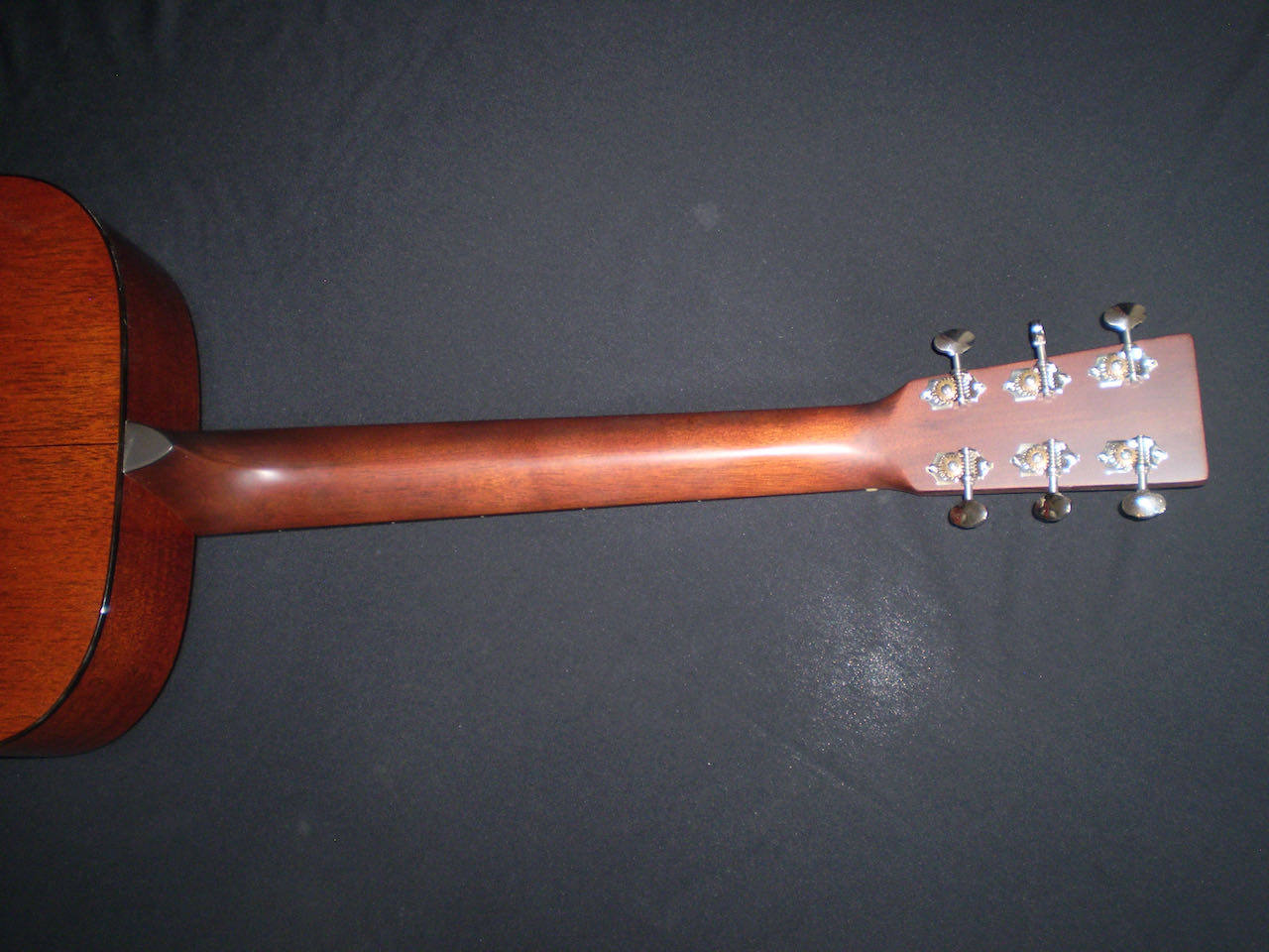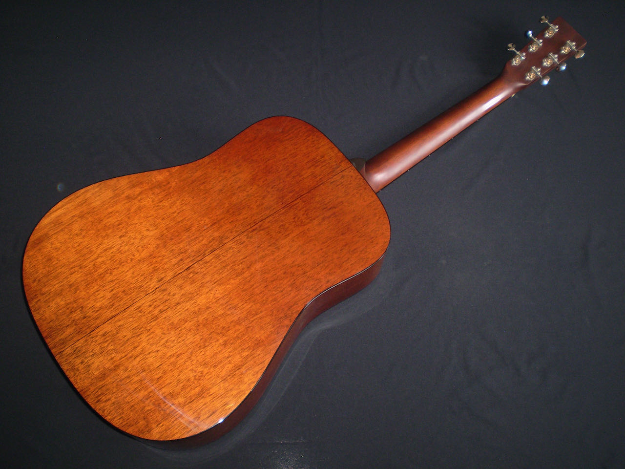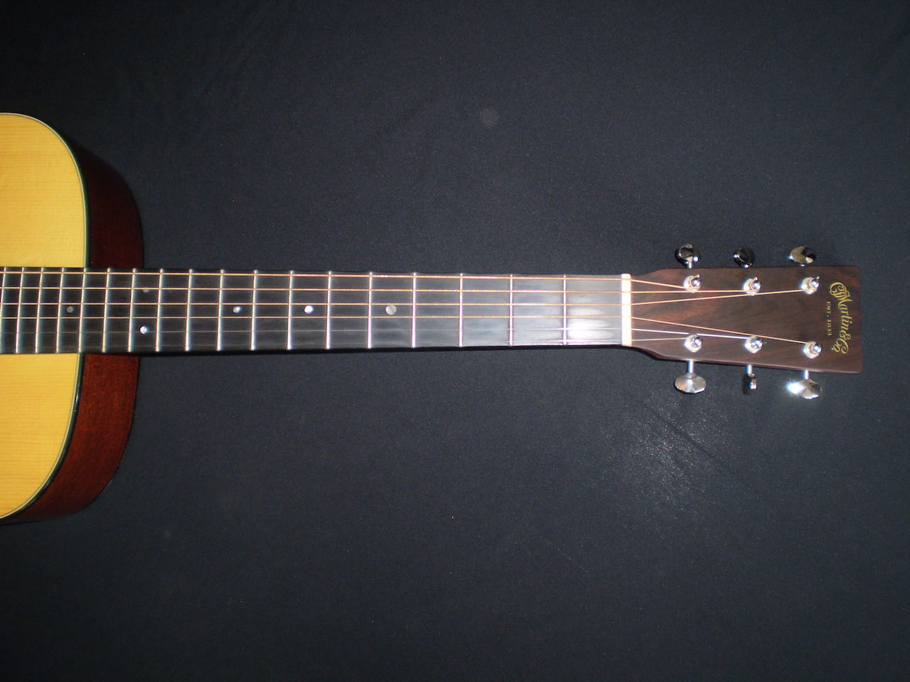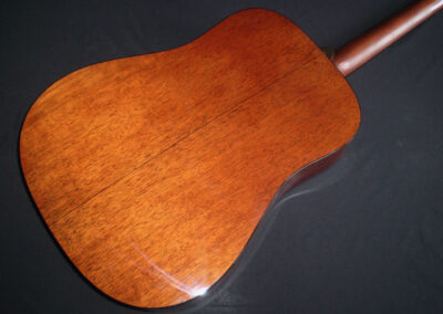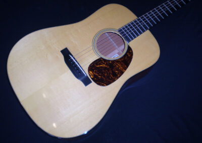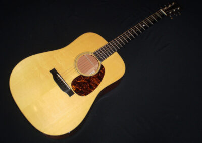 SOLD Martin’s Golden Era series ran from 2000 – 2016, and represented the best features of instruments in that era. However Martin also produced a 1934 Golden Era D18 model which is a more accurately detailed version. The Adirondack Spruce top, Big Leaf Mahogany back and sides with forward shifted scalloped “X” bracing are just a few design features that make this guitar sound different to the other D18’s. It’s a very dynamic sounding guitar, play it lightly and it chimes with open airy undertones, put a pick on it and it roars. The bass is powerful without being boomy, and the trebles are strong and pure. Adirondack takes longer to open up, but at 13 years old, this guitars already sounds mature. Other things to mention are the Ebony fingerboard and bridge, Brazilian headstock and open back Waverley tuners – plus the hand signed label by CF Martin IV. The guitar’s in excellent condition, has great playability, and comes in its original deluxe hard case.