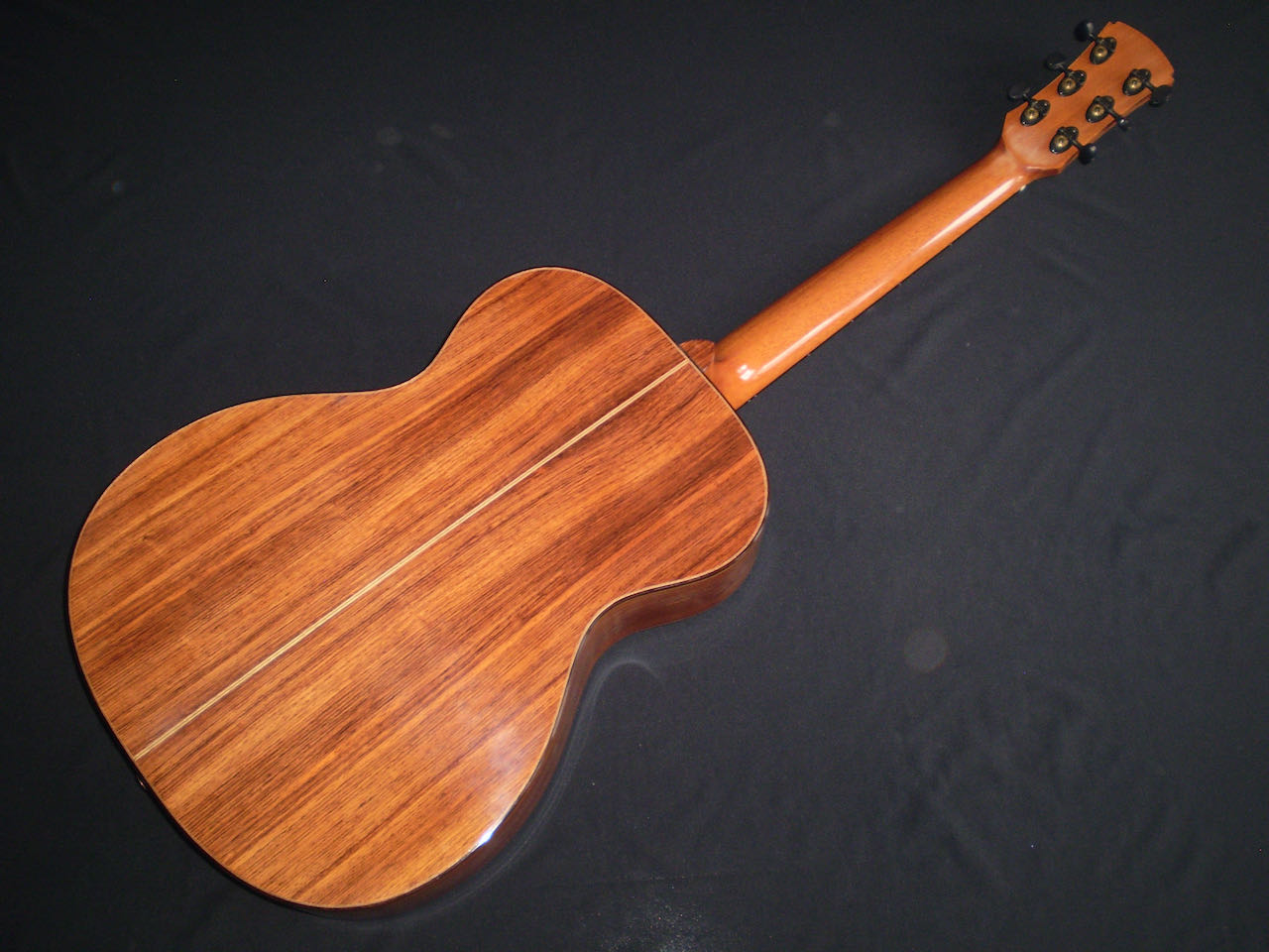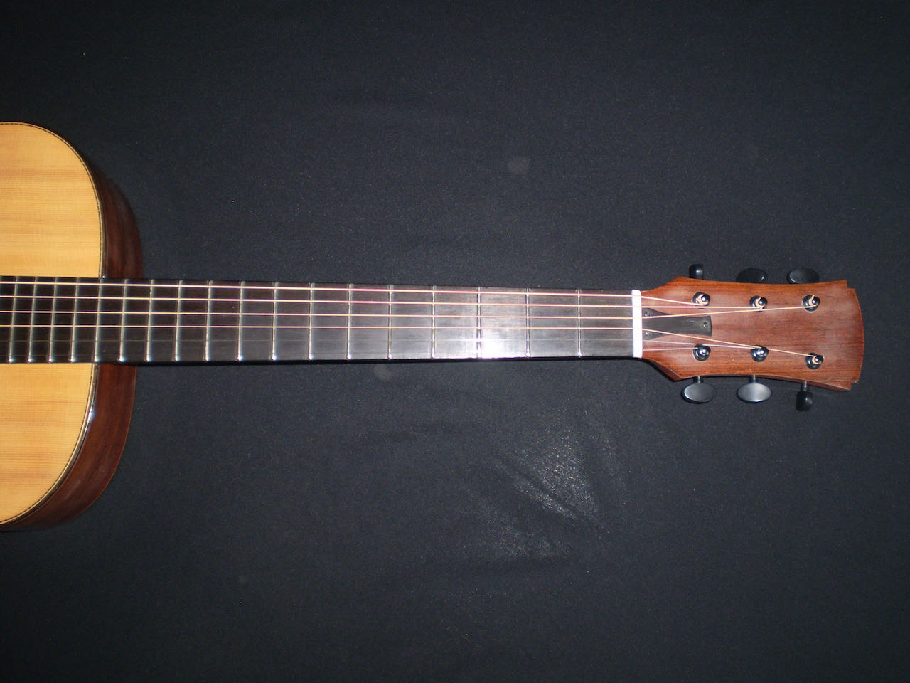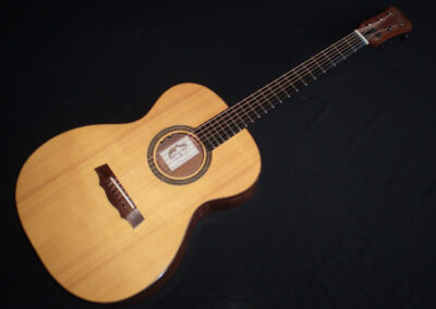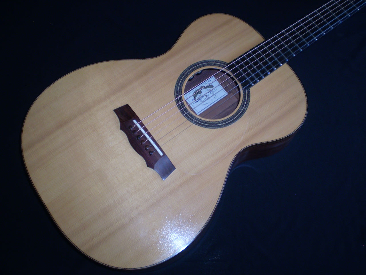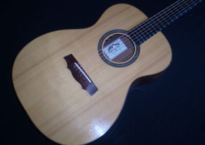 NEW ARRIVAL Renound US luthier Dake Traphagen is best known as a builder of high end classical guitars. But his steel string acoustics are really something special too. Made in the time-honoured way, he still primarily uses hand tools and traditional glues and finishes. This is a 000 body size guitar featuring an Italian Spruce top with Honduran Rosewood back and sides. There’s an Ebony fingerboard, Rosewood bridge, and sleek looking black Schertler tuners. The body binding is Amazon Rosewood, the the double rosette is eye catching Black Palm. Clearly Dake approaches his guitar making from a classical perspective, and it’s refreshingly different to a traditional 000, very rich and beautifully balanced. The guitar works well for all styles, but particularly excels with fingerstyle. Here’s the thing; the guitar has had a reaction to the lacquer finish, resulting in some faded areas around the rims and headstock. It has no affect on the tone or playability of the guitar, but means that the price is greatly reduced. It has a great sounding MiSi Air Trio pickup fitted, and comes in its original hard case.