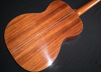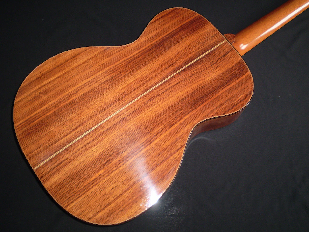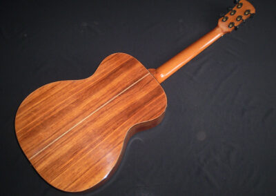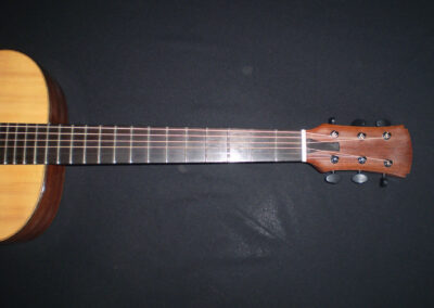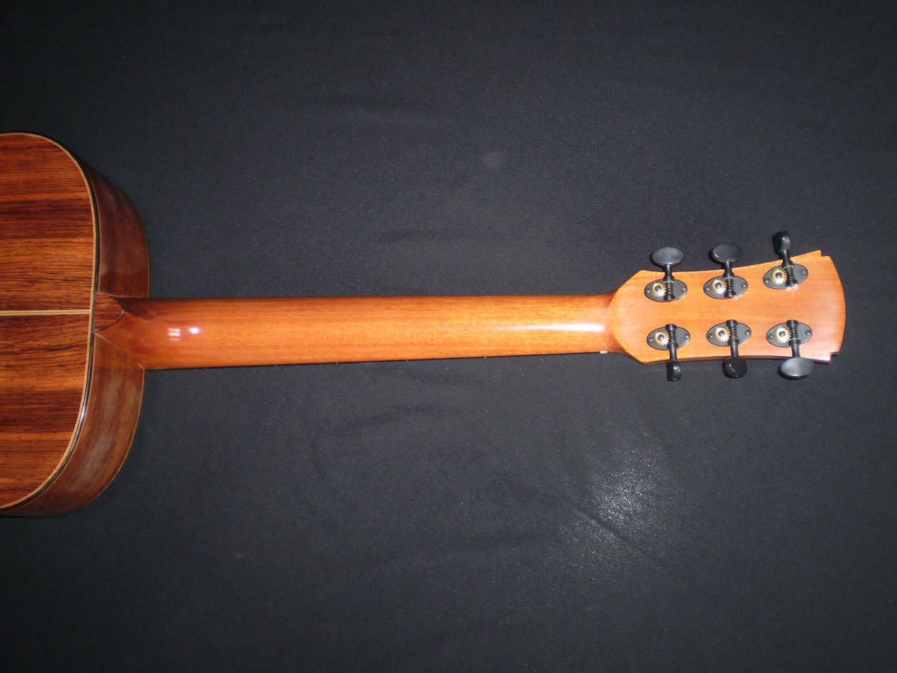 NEW ARRIVAL Renound US luthier Dake Traphagen is best known as a builder of high end classical guitars. But his steel string acoustics are really something special too. Made in the time-honoured way, he still primarily uses hand tools and traditional glues and finishes. This is a 000 body size guitar featuring an Italian Spruce top with Honduran Rosewood back and sides. There’s an Ebony fingerboard, Rosewood bridge, and sleek looking black Schertler tuners. The body binding is Amazon Rosewood, the the double rosette is eye catching Black Palm. Clearly Dake approaches his guitar making from a classical perspective, and it’s refreshingly different to a traditional 000, very rich and beautifully balanced. The guitar works well for all styles, but particularly excels with fingerstyle. Here’s the thing; the guitar has had a reaction to the lacquer finish, resulting in some faded areas around the rims and headstock. It has no affect on the tone or playability of the guitar, but means that the price is greatly reduced. It has a great sounding MiSi Air Trio pickup fitted, and comes in its original hard case.