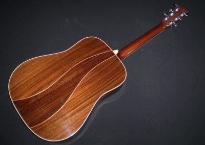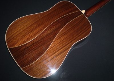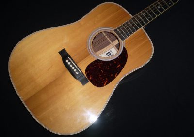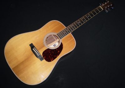 SOLD For Martin’s 50th anniversary D35, they pulled out all the stops making it the most visually striking D35 ever – only made in very small numbers, the traditional 3 piece back has curved lines, which are also mimicked on the headstock plate, a really quite beautiful piece of craftsmanship. A lot of people consider the Martin D35 to be a deluxe version of a D28, which is arguably the benchmark Spruce / Rosewood dreadnought. Tonally it has a very complex sound, great depth and resonance, plenty of punch and attack, and well balanced with superbly articulated clarity. This example sounds great strummed or fingerpicked, and great definition and sustain when soloing. From a playability point of view, this guitar is a treat, the neck has a great feel to it, and the action is just right. The guitar is in excellent, all original condition, with just very light playwear, has a Fishman Aura pickup system fitted and comes in it’s original Martin hard case.