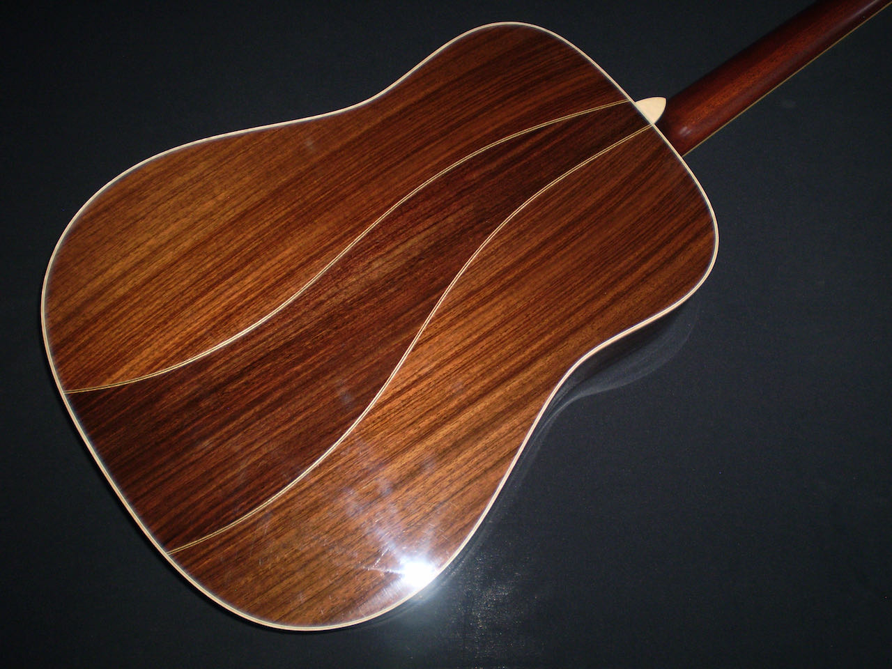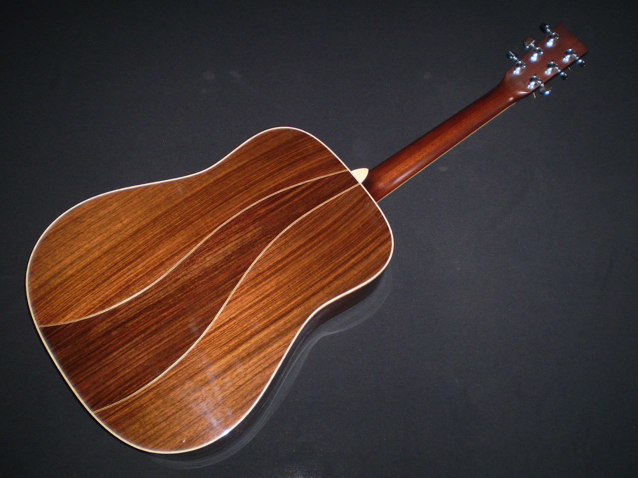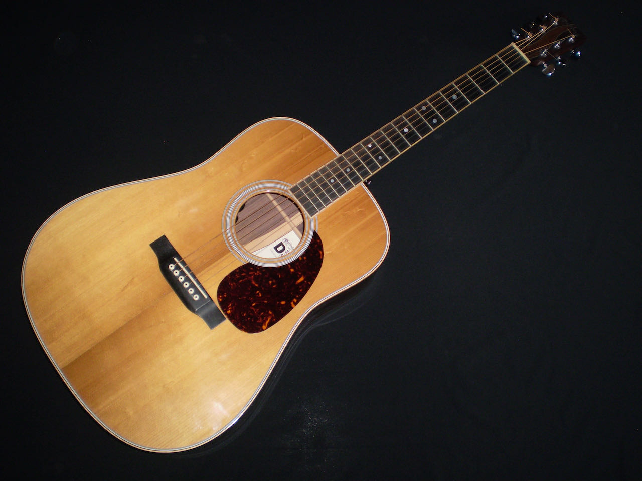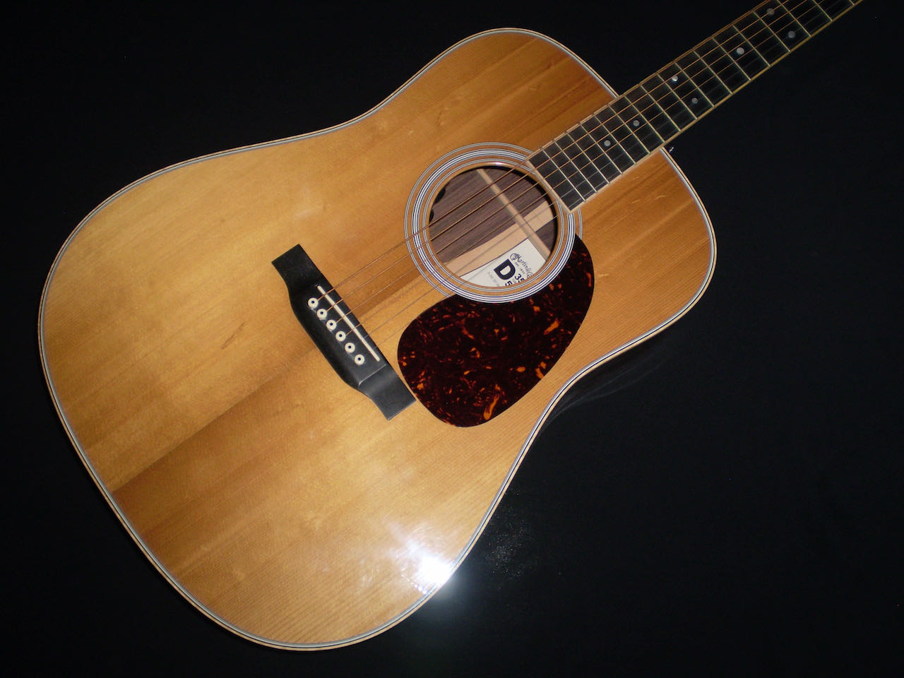 SOLD For Martin’s 50th anniversary D35, they pulled out all the stops making it the most visually striking D35 ever – only made in very small numbers, the traditional 3 piece back has curved lines, which are also mimicked on the headstock plate, a really quite beautiful piece of craftsmanship. A lot of people consider the Martin D35 to be a deluxe version of a D28, which is arguably the benchmark Spruce / Rosewood dreadnought. Tonally it has a very complex sound, great depth and resonance, plenty of punch and attack, and well balanced with superbly articulated clarity. This example sounds great strummed or fingerpicked, and great definition and sustain when soloing. From a playability point of view, this guitar is a treat, the neck has a great feel to it, and the action is just right. The guitar is in excellent, all original condition, with just very light playwear, has a Fishman Aura pickup system fitted and comes in it’s original Martin hard case.