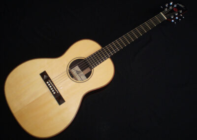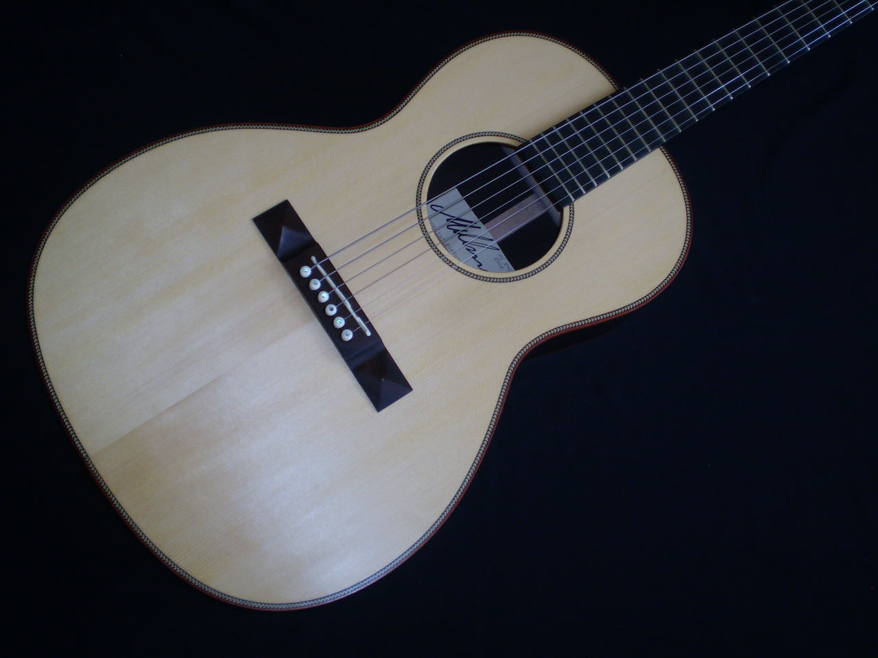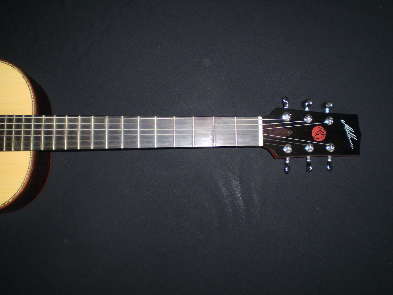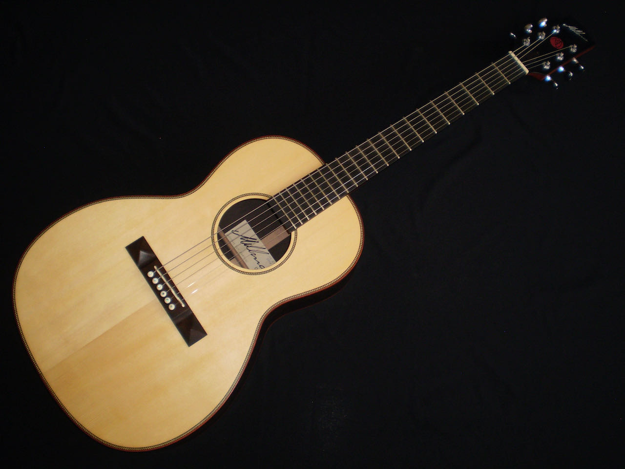 SOLD I’ve had several Millman guitars over the years, and each one is an absolute pleasure to behold. His use of traditional building techniques is quite refreshing, and his ability to acquire the most desirable tone woods is a skill in itself. This custom built parlour guitar features the ultimate combination – an Adirondack Spruce top over Brazilian Rosewood back and sides, finished with a hand rubbed, organic oil finish. It has an Ebony fingerboard, and Brazilian Rosewood pyramid bridge, herringbone rosette and binding, and an elongated headstock to increase mass with a set of Gotoh 510 tuners fitted. The guitar is a wonderful fingerpicker, the tone is even and rich with great clarity and impressive sustain. Surprisingly loud for it’s size, the Adirondack gives a dynamic punch, and the Brazilian Rosewood adds definition. The guitar is in excellent condition, with just one repaired back crack. It has great playability, and a real hand made feel. It comes in it’s original hard case.