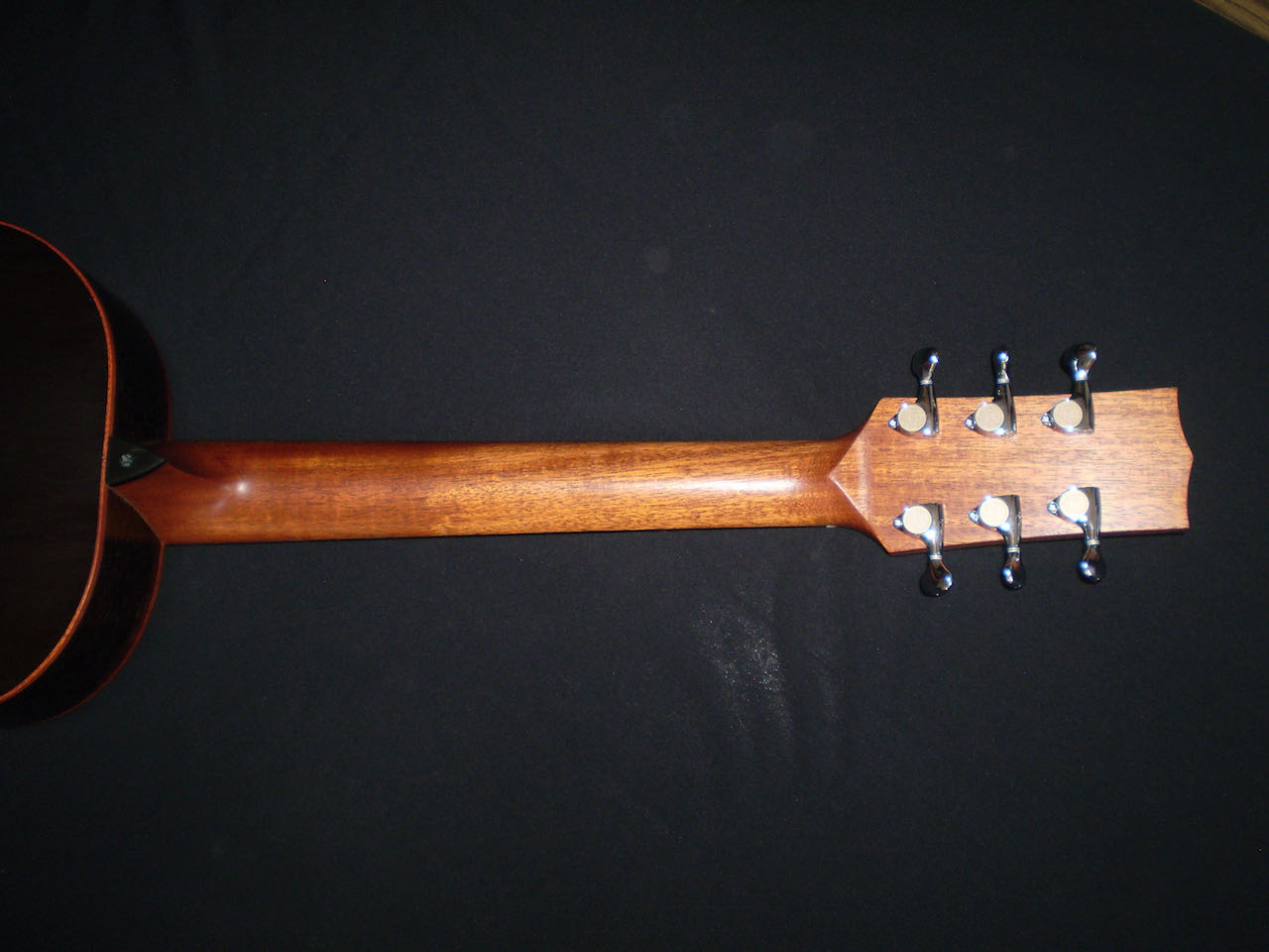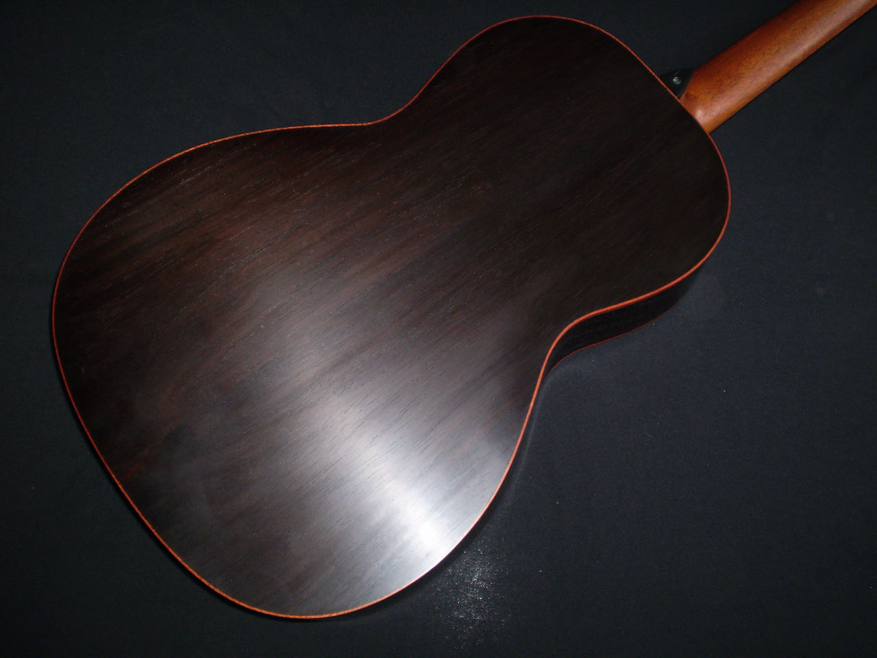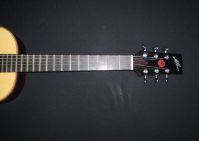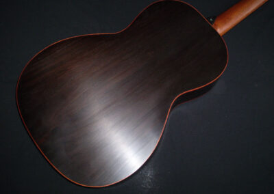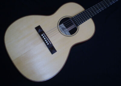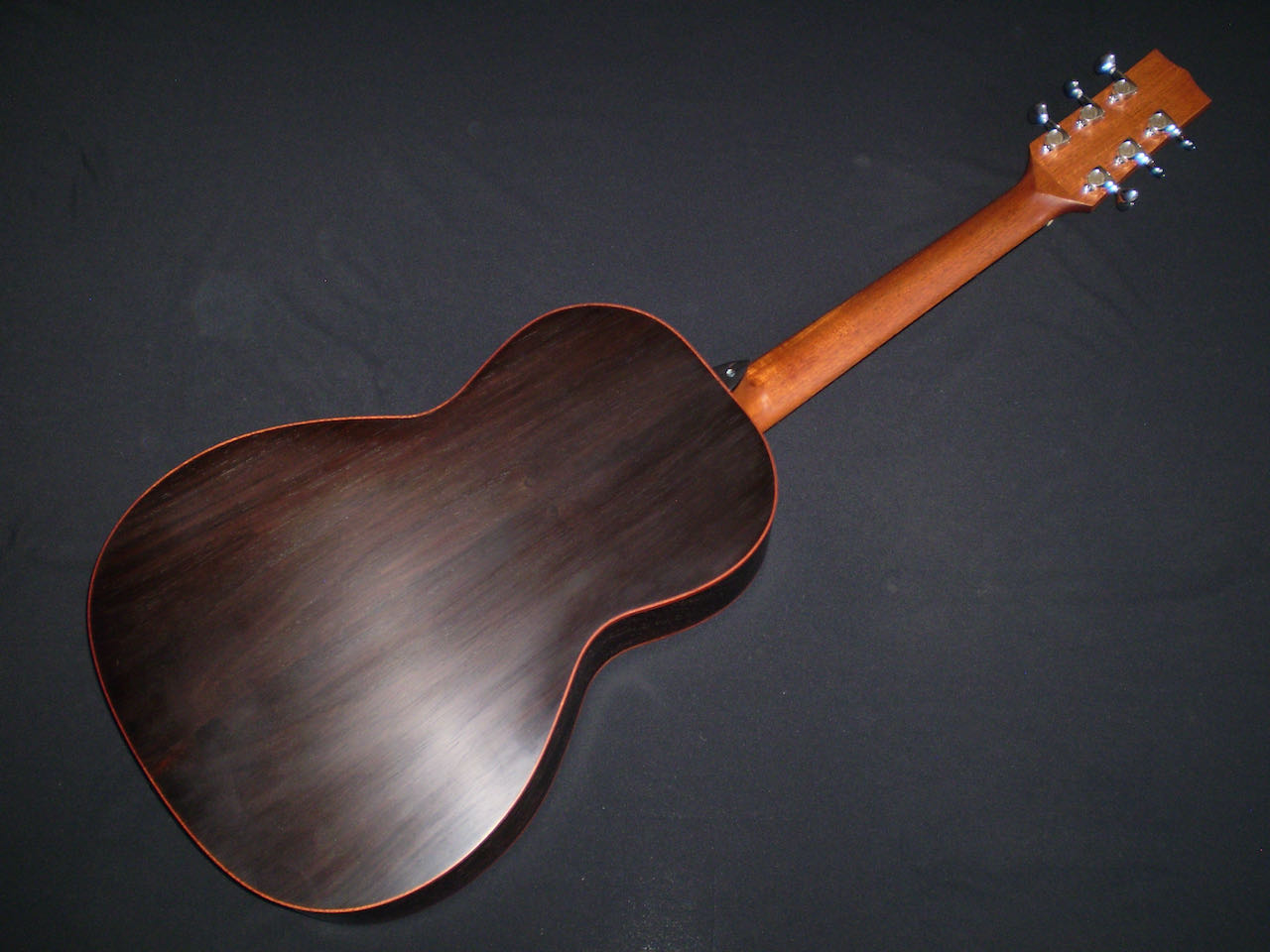 SOLD I’ve had several Millman guitars over the years, and each one is an absolute pleasure to behold. His use of traditional building techniques is quite refreshing, and his ability to acquire the most desirable tone woods is a skill in itself. This custom built parlour guitar features the ultimate combination – an Adirondack Spruce top over Brazilian Rosewood back and sides, finished with a hand rubbed, organic oil finish. It has an Ebony fingerboard, and Brazilian Rosewood pyramid bridge, herringbone rosette and binding, and an elongated headstock to increase mass with a set of Gotoh 510 tuners fitted. The guitar is a wonderful fingerpicker, the tone is even and rich with great clarity and impressive sustain. Surprisingly loud for it’s size, the Adirondack gives a dynamic punch, and the Brazilian Rosewood adds definition. The guitar is in excellent condition, with just one repaired back crack. It has great playability, and a real hand made feel. It comes in it’s original hard case.